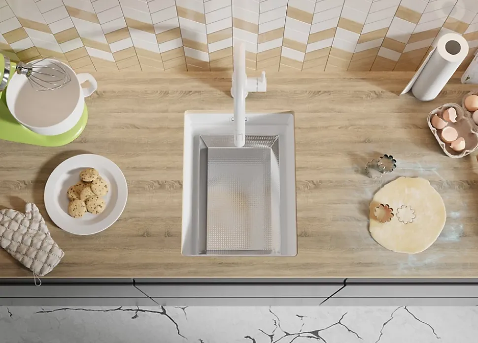 - ✅ FLEXIBILTÉ DE CONCEPTION des trous pour le robinet et d’autres accessoires (distributeur, bouton vidage Classique) peuvent être réalisés dans le plan de travail