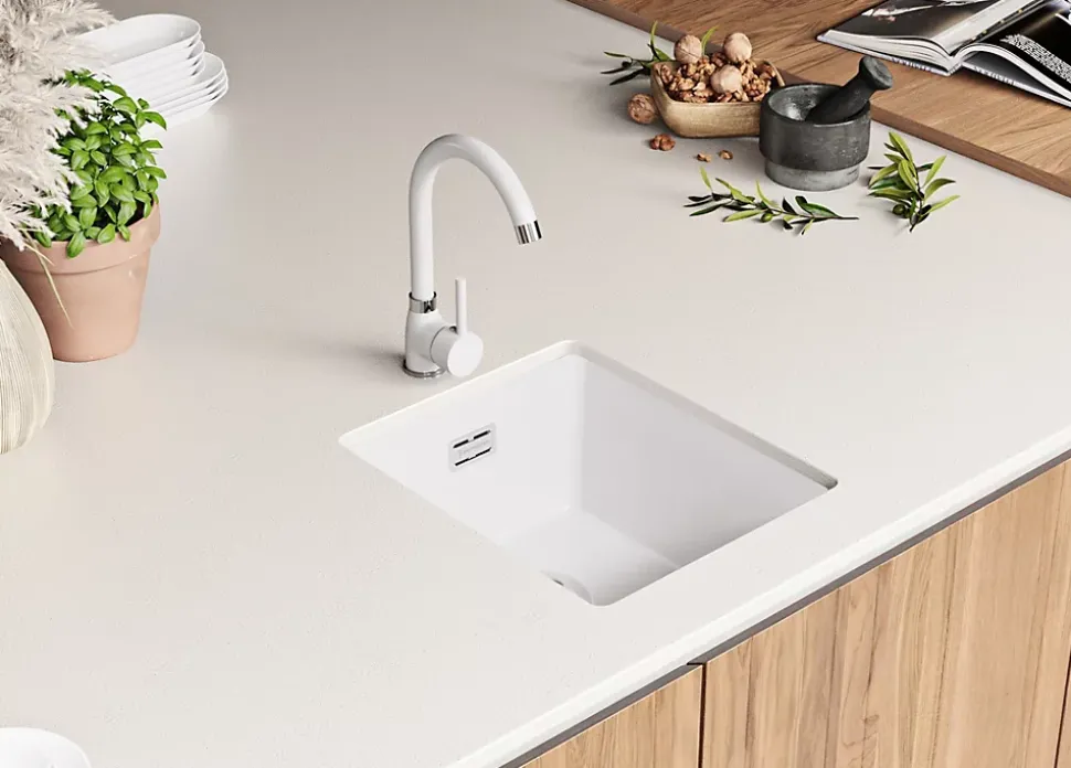 PRIMAGRAN Evier Sous Plan Blanc 36x47cm, Evier en Granit 1 bac + Kit de Vidage, Évier au meuble 40cm – London