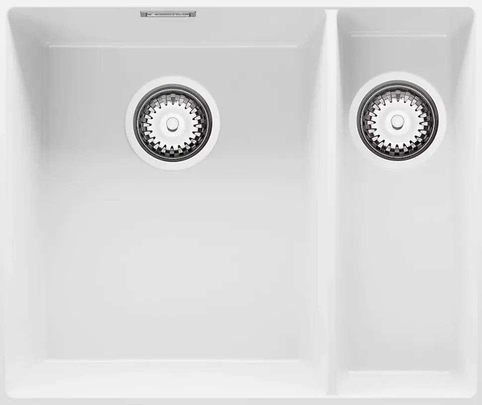 PRIMAGRAN Evier Sous Plan Blanc 56x47cm, Evier en Granit 1,5 bacs + Kit de Vidage, Évier au meuble 60cm – London Duo