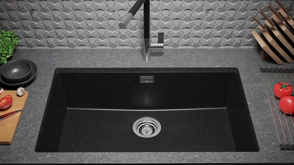 PRIMAGRAN Evier Sous Plan Graphite 76x47cm, Evier en Granit 1 bac + Kit de Vidage, Évier au meuble 80cm – London