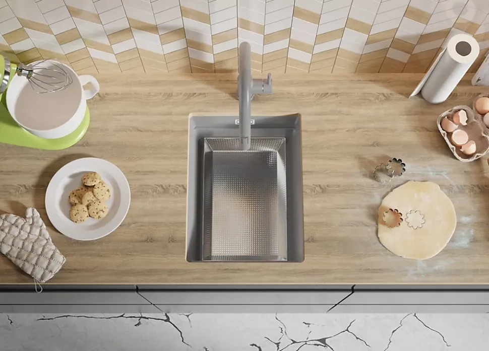 PRIMAGRAN Evier Sous Plan Gris 36x47cm, Evier en Granit 1 bac + Kit de Vidage + Accessoires, Évier au meuble 40cm – Prague