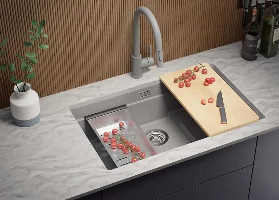 - ✅ Le kit comprend – Évier Prague 80 Step Level, kit complet de vidange (siphon haute qualité, trop-plein, raccordement supplémentaire pour lave-linge ou lave-vaisselle), égouttoir enroulable.