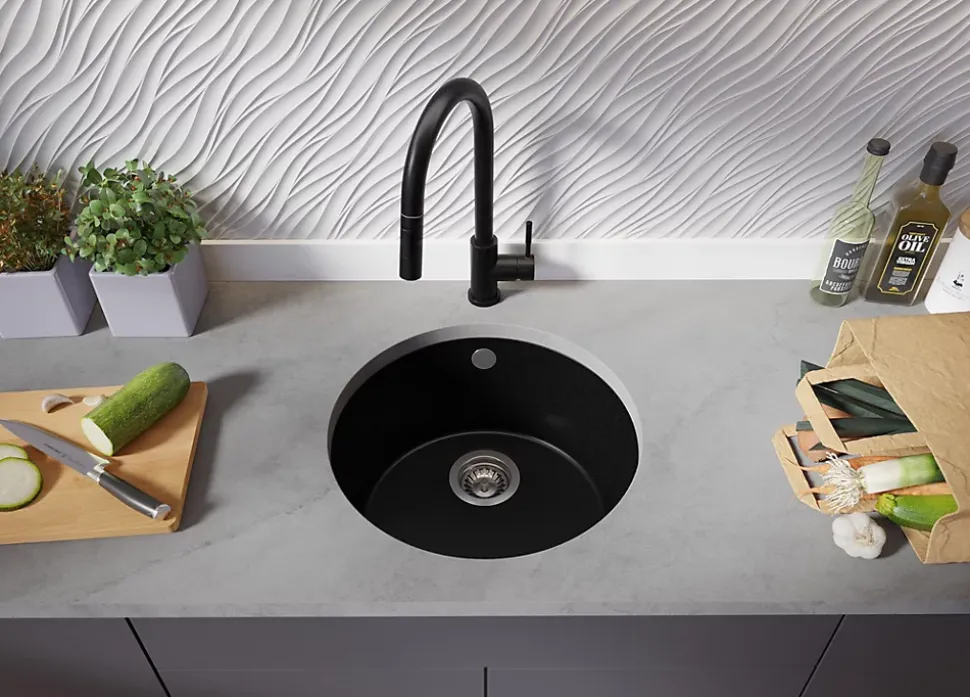 Évier sous plan en granit La Valette 50 – minimalisme classique L’évier La Valette 50 est un modèle conçu dans un esprit minimaliste sans ornements superflus. La cuve parfaitement ronde apporte attrait et élégance à votre cuisine aménagée sans compromettre le confort d’utilisation au quotidien. Le modèle La Valette 50 est un évier compact, ce qui le rend idéal pour toute cuisine, même petite, occupant peu d’espace de travail sur le plan de travail. Vous pouvez installer l’évier dans un meuble de 50, 60, 70 cm et plus, ainsi que dans des meubles d’angle. Le kit comprend: Évier La Valette 50, Robinet de cuisine BW9010-KC, kit complet de vidange (siphon haute qualité, trop-plein, raccordement supplémentaire pour lave-linge ou lave-vaisselle), flexibles de raccordement 3/8” de 400 mm, double joints d’étanchéité.