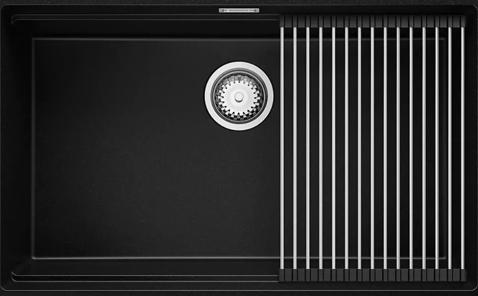 PRIMAGRAN Evier Sous Plan Noir 76x47cm, Evier en Granit 1 bac + Kit de Vidage + Accessoires, Évier au meuble 80cm – Prague