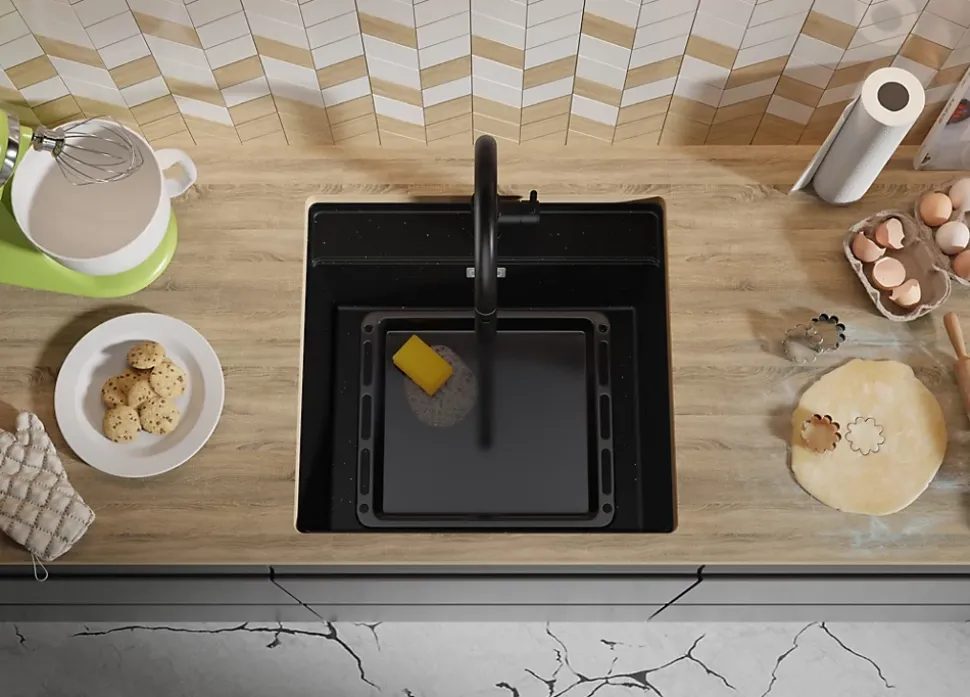 - ✅ Le kit comprend – Évier Bergen 60 Low Cut Top, kit complet de vidange (siphon haute qualité, trop-plein, raccordement supplémentaire pour lave-linge ou lave-vaisselle), planche à découper.