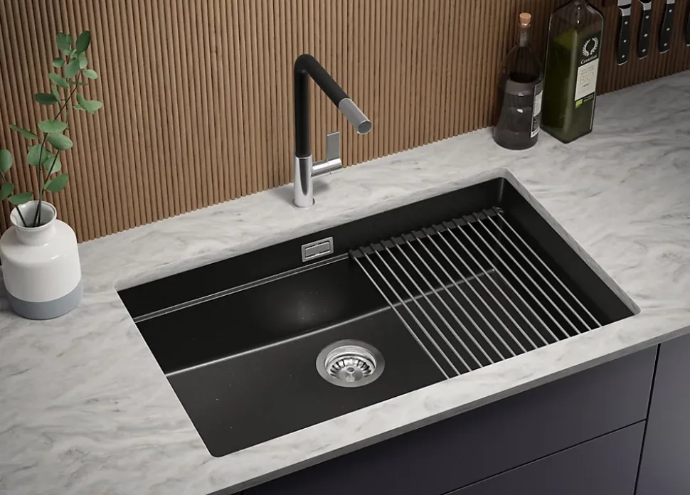 - ✅ Le kit comprend – Évier Prague 80 Level, kit complet de vidange (siphon haute qualité, trop-plein, raccordement supplémentaire pour lave-linge ou lave-vaisselle), égouttoir enroulable.