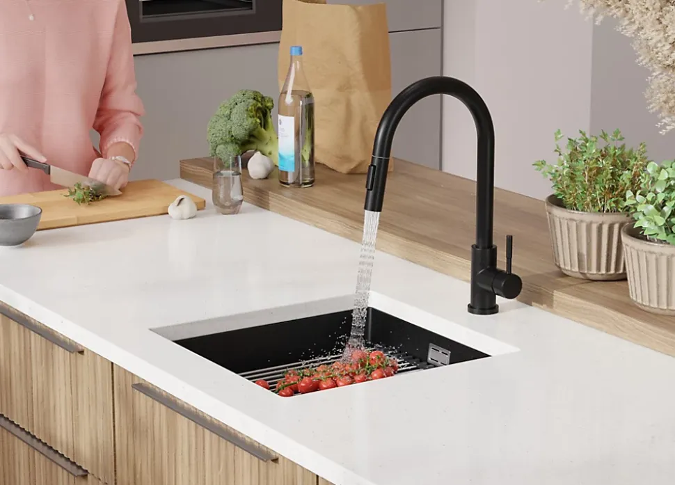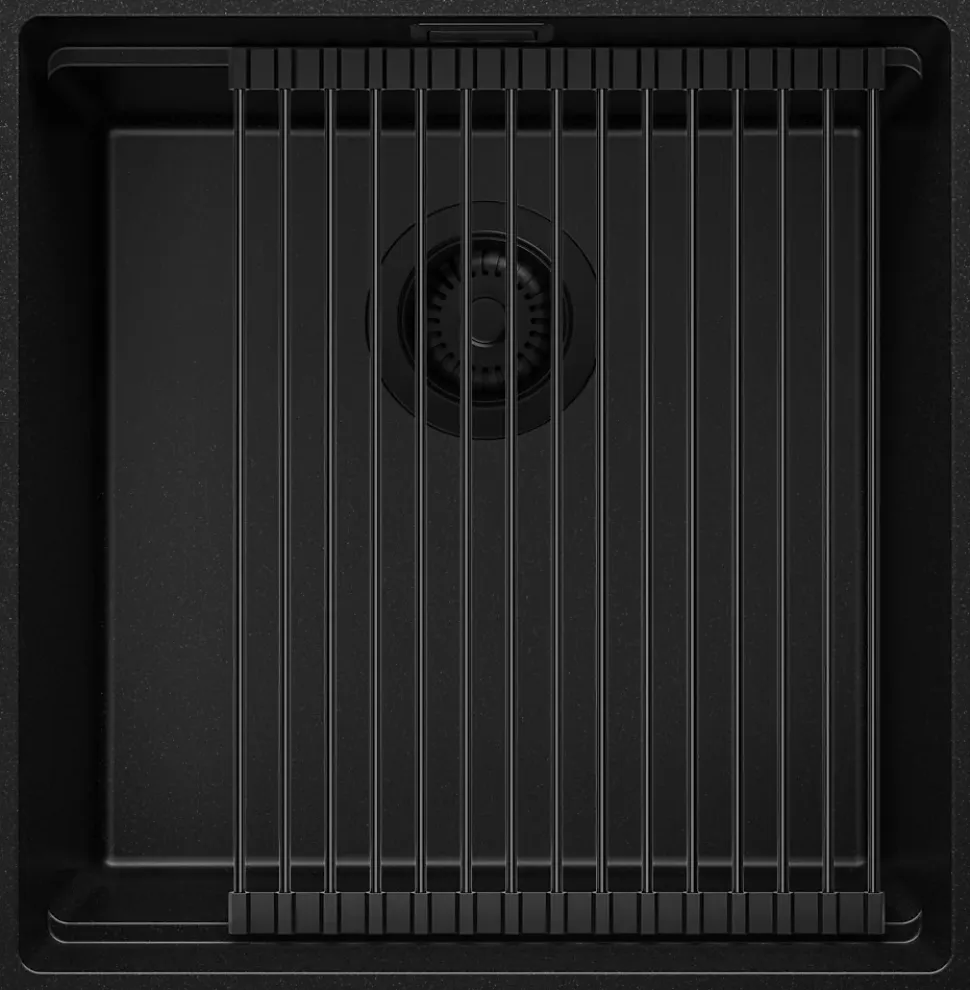 PRIMAGRAN Evier Sous Plan Tout Noir 46x47cm, Evier en Granit 1 bac + Kit de Vidage + Accessoires, Évier au meuble 50cm – Prague