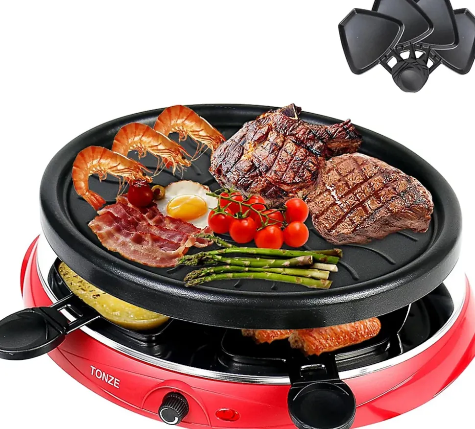 Cette raclette électrique rouge pour 4 personnes allie rapidité, confort et polyvalence. Son appareil chauffe en seulement 5 minutes et vous permet de préparer fromage fondu, légumes grillés, crevettes ou même des crêpes grâce à ses 4 poêlons extra-larges antiadhésifs. La surface amovible transforme l’appareil en plancha électrique en un clin d’œil pour varier vos repas. Pratique et facile à nettoyer, les poêlons et la surface se lavent rapidement avec un chiffon humide. Sécurisée et stable, cette raclette dispose de poignées anti-chaleur et d’un indicateur lumineux de chauffe. Compacte, elle s’adapte parfaitement aux petites cuisines tout en garantissant des repas conviviaux et gourmands à partager avec vos proches.