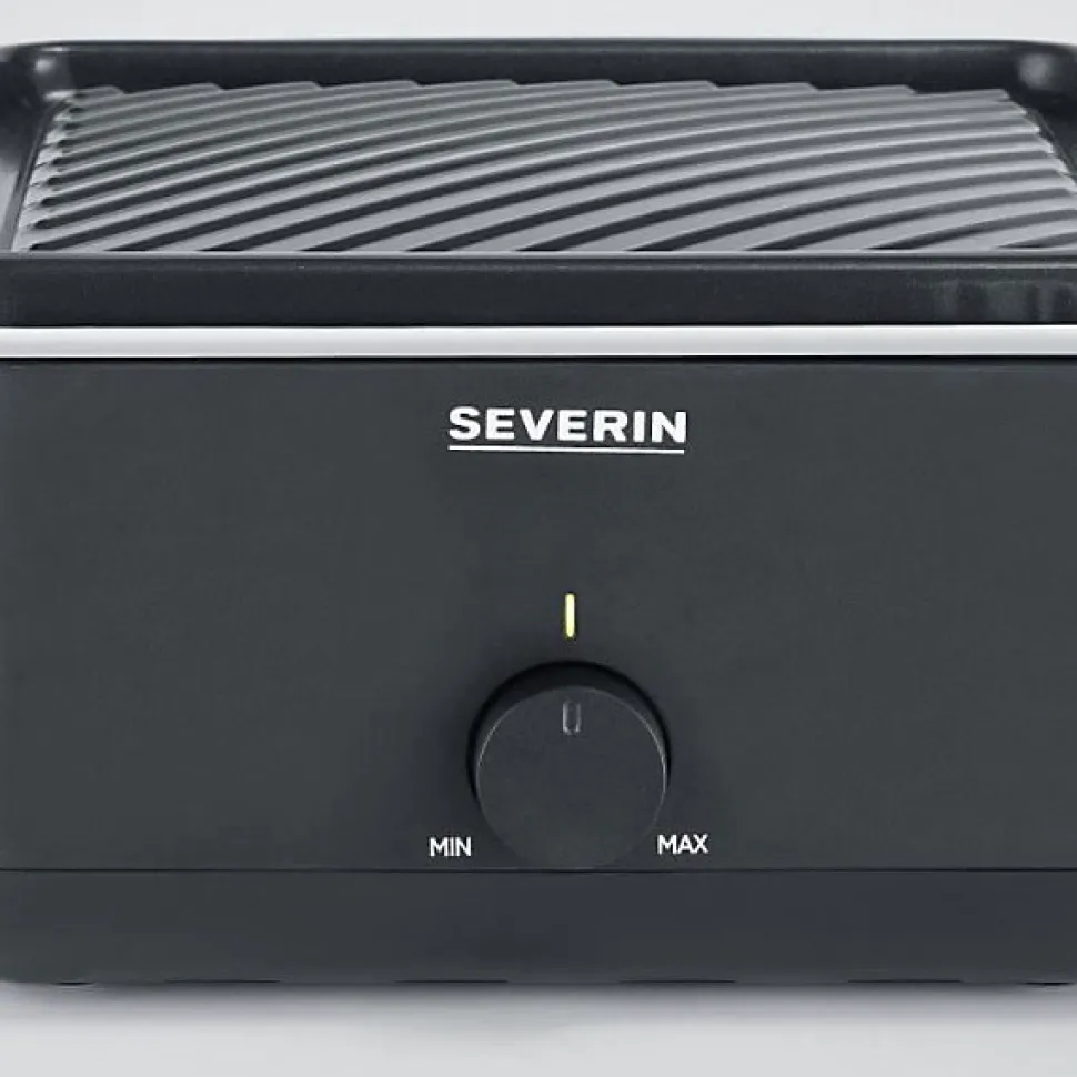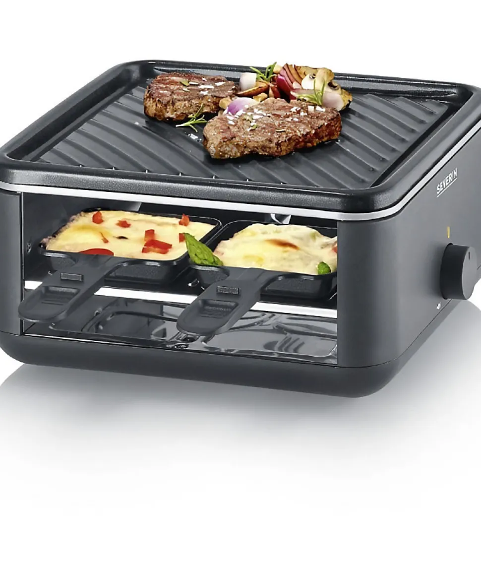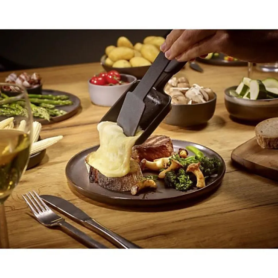 Mini-gril raclette 4 personnes idéal pour les petits ménages, avec surface antiadhésive de 24 x 24 cm, poêlons extra profonds, thermostat réglable et rangement intégré pour spatules et poêlons.