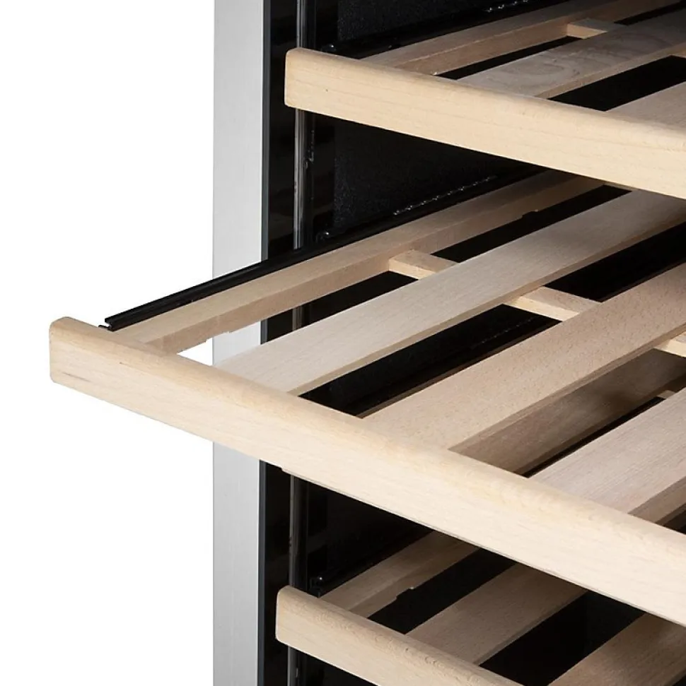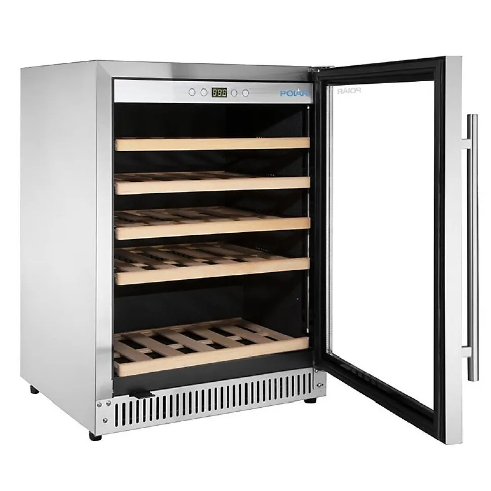 Rafraîchisseur à Vin Dessous de Comptoir en Inox Série G 51 Bouteilles Rafraîchisseurs efficaces et peu bruyants à thermostats réglables, portes réversibles et pieds réglables pour une flexibilité optimale lors de l’installation (ne conviennent pas pour le vin rouge). CE203 et CE204 disposent d’un éclairage intérieur pour une mise en avant. _ 150W. Peut contenir jusqu’à 51 bouteilles _ 820(H) x 595(L) x 580(P) mm _ 51 bouteilles de style Bordeaux de 750ml _ Construction robuste et facile à nettoyer en acier inoxydable _ Refroidissement assisté par ventilateur assurant une température interne constante _ 5 étagères en bois _ Le dégivrage automatique maintient l’efficacité et la performance _ Contrôleur numérique tactile convivial avec affichage LED _ Isolation de 40mm améliorant l’efficacité de refroidissement