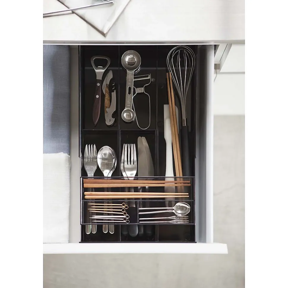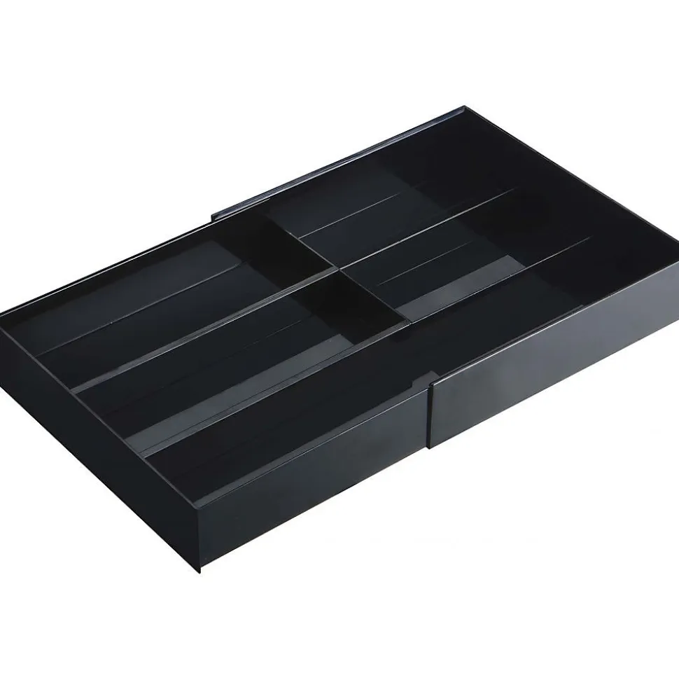 Aspect : Coloris = Noir • Matériau principal = ABS • Matériaux secondaires = Résine • Dimensions : Hauteur (en cm) = 5,70 • Longueur (en cm) = 25 • Profondeur (en cm) = 24,60 • Autres caractéristiques : Informations complémentaires = Extensible : de 24.6 à 45 cm de longueur , Contenant supérieur amovible • Poids (en kg) = 0,75 • Range couverts extensible Tower