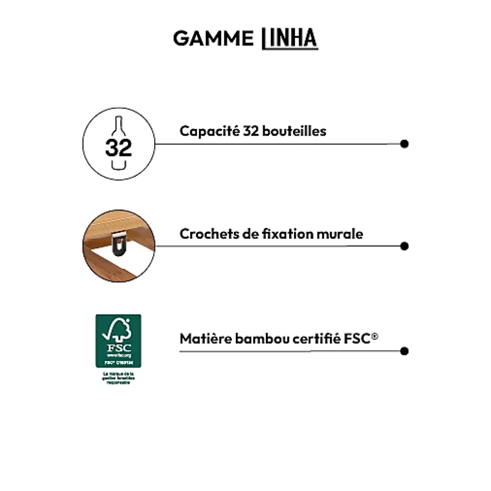 Dimensions : L.89 x P.45 x H.24cmPoids : 5,48 kgMatière de la structure : BambouCapacité : 32 bouteillesNombre d’étagères : 8Système de fixation : À poser
