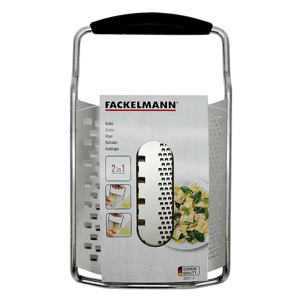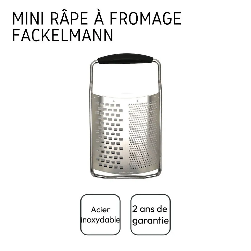 - DESCRIPTION : Fackelmann vous propose cette râpe à fromage 2 en 1 en acier inoxydable. Cette râpe est parfaite pour le fromage mais également pour râper des carottes par exemple.