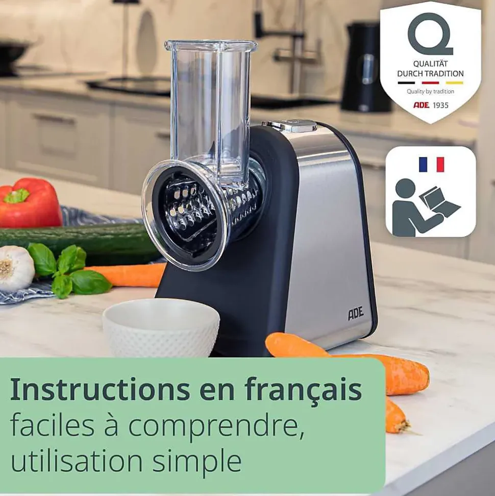 Râpe électrique ADE 200 W avec 4 inserts interchangeables en acier inoxydable (râpe grossière, 2 râpes fines et rabot), boîtier compact à panneaux aspect inox, trémie large avec cône poussoir transparent, pieds antidérapants et rangement du câble. Parties amovibles compatibles lave‑vaisselle. Usage polyvalent pour chocolat, noix et légumes ; pause de refroidissement recommandée après environ 3 minutes d’utilisation continue.
