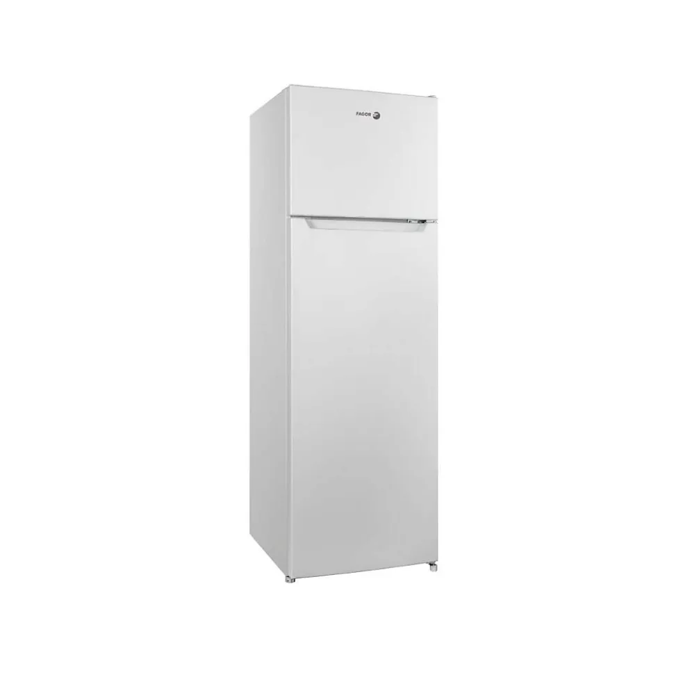 Réfigérateur combiné 54cm 261l statique blanc Fagor – Réfigérateur combiné FDP261EW de Fagor – Type de produit : Réfrigérateur 2 portes.Type de construction : Pose libre.Volume total (L) : 261.Classe d’efficacité énergétique : E.Emissions de bruit acoustique dans l’air (dB(A)) : 39.Classe d’émission de bruit acoustique dans l’air : C.Conso. d’énergie annuelle (kWh/an) : 189.Classe climatique : N-ST. Cet appareil est conçu pour être utilisé à une température ambiante comprise entre 16°C et 38°C.Réglage hiver : Non.Volume compartiment réfrigérateur (L) : 209.T°C recommandée pour stockage optimisé des denrées alimentaires fraîches (°C) : 4.Mode de dégivrage réfrigérateur : Manuel.Volume compartiment congélateur (L) : 52.T°C recommandée pour stockage optimisé des denrées alimentaires dans compartiment 4 étoiles (°C) : -18.Mode de dégivrage congélateur : Manuel.Pouvoir de congélation spécifique (kg/24h) : 2.5.Autonomie (h) : 8.Régulation de la température : Mécanique.Réfrigérateur connecté : Non.Dispositif de congélation rapide : Non.Type de dégivrage : Manuel.Type de froid du réfrigérateur : Statique.Type de clayette(s) : Verre.Nbre total de clayette(s) : 3.Nbre de balconnets contre-porte : 4.Type d’éclairage : LED.Autre(s) équipement(s) : Bac à légumes.Nombre d’étoiles : 4.Position du congélateur : Haut.Dégivrage congélateur : Manuel.Type de froid du congélateur : Statique.Autre(s) équipement(s) : 1 clayette.Distributeur d’eau : Non.Porte réversible : Oui.Type de poignée(s) : Externe.Ecran : Non.Couleur : Blanc.Hauteur (cm) : 169.Largeur (cm) : 54.Profondeur (cm) : 55.1.Poids (kg) : 44.