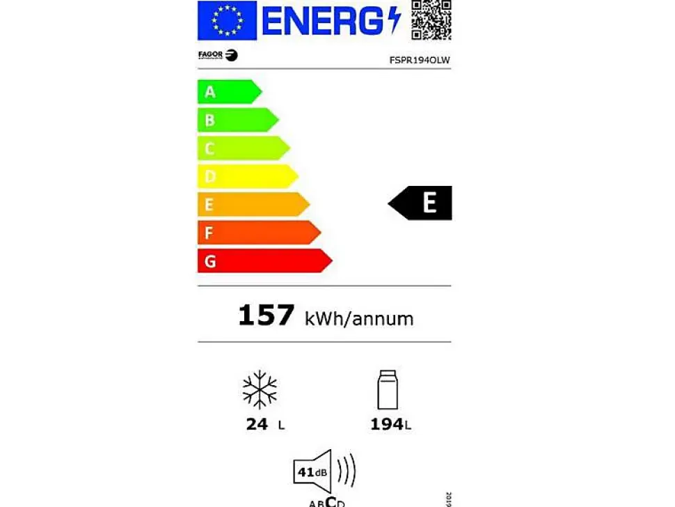 Réfrigérateur 1 porte 55cm 218l Fagor – Réfrigérateur 1 porte FSPR194OLW de Fagor.Le FSPR194OLW est un réfrigérateur pose libre conçu pour s’intégrer parfaitement dans votre cuisine. Compact, fonctionnel et silencieux, il offre une organisation pratique pour les aliments frais, tout en étant économe en énergie.Porte graphisme OL teintée dans la masse. – Type de produit : Réfrigérateur 1 porte.Type de construction : Pose libre.Réfrigérateur connecté : Non.Volume total (L) : 218.Classe d’efficacité énergétique : E.Emissions de bruit acoustique dans l’air (dB(A)) : 41.Classe d’émission de bruit acoustique dans l’air : C.Conso. d’énergie annuelle (kWh/an) : 157.Classe climatique : ST.Autonomie (h) : 15.Réglage hiver : Non.Volume compartiment réfrigérateur (L) : 194.T°C recommandée pour stockage optimisé des denrées alimentaires fraîches (°C) : 4.Mode de dégivrage réfrigérateur : Manuel.Volume compartiment congélateur (L) : 24.T°C recommandée pour stockage optimisé des denrées alimentaires dans compartiment 4 étoiles (°C) : -18.Régulation de la température : Mécanique.Mode de dégivrage congélateur : Manuel.Pouvoir de congélation spécifique (kg/24h) : 2.Dispositif de congélation rapide : Non.Type de source lumineuse : LED.Type de dégivrage : Manuel.Type de froid du réfrigérateur : Statique.Type de clayette(s) : Verre finition silver.Nbre total de clayette(s) : 3.Nbre de balconnets contre-porte : 4.Type d’éclairage : LED.Autre(s) équipement(s) : Bac à légumes, Support à œufs, Contre-porte modulable.Nombre d’étoiles : 4.Position du congélateur : Haut.Dégivrage congélateur : Manuel.Type de froid du congélateur : Statique.Distributeur d’eau : Non.Porte réversible : Oui.Type de poignée(s) : Externe métal.Ecran : Non.Divers : Porte graphisme OL teintée dans la masse.Couleur :
