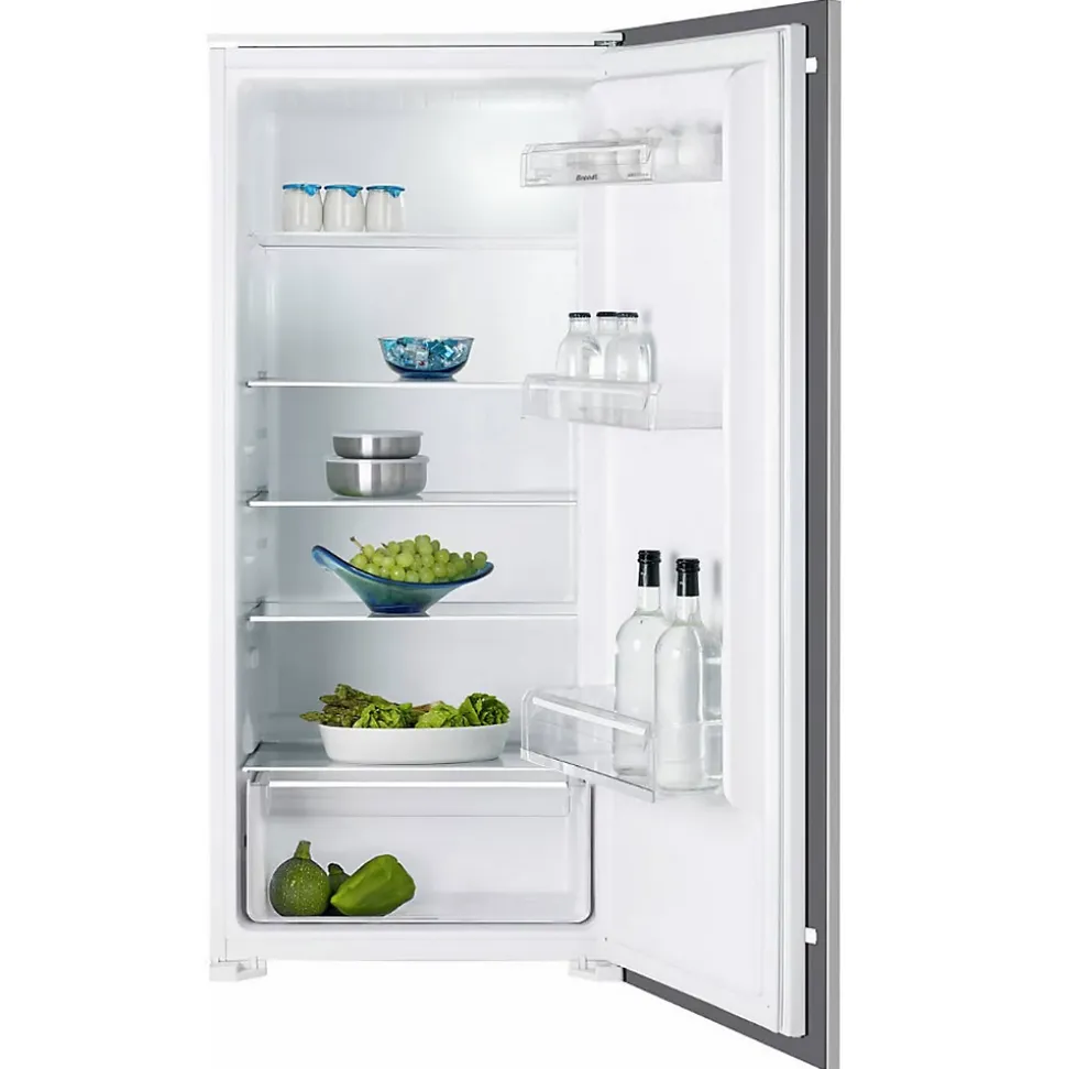 Réfrigérateur 1 porte intégrable à glissières 199l Brandt – Réfrigérateur 1 porte encastrable Brandt BIL1220ES avec électronique intérieure pratique et précise : L’électronique placée à l’intérieur de votre réfrigérateur vous permet de régler la température avec précision pour plus de sécurité. L’installation est très simple : un système de glissières, très pratique, permet d’apposer sans difficulté la porte d’habillage sur la porte de l’appareil. Classe climatique SN-T : Grâce à la classe climatique tropicale élargie, votre appareil peut fonctionner dans un environnement entre 10 et 43°C. La meilleure performance du marché ! – Type de produit : Réfrigérateur intégré 1 porte.Type de construction : Intégrable.IEE : 99.Volume total (L) : 199.Classe d’efficacité énergétique : E.Emissions de bruit acoustique dans l’air (dB(A)) : 39.Classe d’émission de bruit acoustique dans l’air : C.Conso. d’énergie annuelle (kWh/an) : 100.Classe climatique : SN-T. Cet appareil est conçu pour être utilisé à une température ambiante comprise entre 10°C et 43°C.Réglage hiver : Non.Volume compartiment réfrigérateur (L) : 199.Type de source lumineuse : LED.Classe d’efficacité énergétique de la source lumineuse : G.Type réfrigérateur : Réfrigérateur 1 porte.Nbre de porte(s) : 1.Tout utile : Oui.Régulation de la température : Electronique.Réfrigérateur connecté : Non.Type de dégivrage : Manuel.Type de froid du réfrigérateur : Statique.Type de clayette(s) : Verre.Nbre de clayette(s) réglable(s) : 3.Nbre de balconnets contre-porte : 3.Type d’éclairage : LED.Position du congélateur : Pas de congélateur.Porte à habiller : Oui.Porte d’habillage fournie : Non (nécessite la pose d’une porte assortie à la cuisine).Système de porte : Glissières.Porte réversible : Oui.Distributeur d’eau : Non.Equipement réfrigérateur : Bac à légumes, Support à