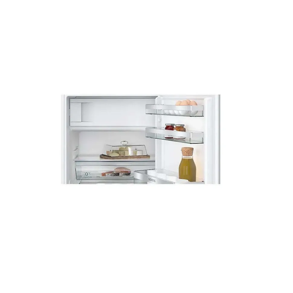 Réfrigérateur 1 porte intégrable à pantographe 110l Siemens – Réfrigérateur compact KU22LADD0 de Siemens encastrable avec compartiment congélateur 4 étoiles pour une fraîcheur permanente : zone climatisée, accès facile et alarme de porte. La touche Super-Réfrigération abaisse la température pendant une période définie afin de rafraîchir rapidement les aliments que vous rangez dans votre réfrigérateur. – Type de produit : Réfrigérateur intégrable.Design : Encastrable.Classe d’efficacité énergétique : D.Consommation énergétique annuelle moyenne : 119 kWh / an.Volume total : 110 l.Volume utile partie congélation : 17 l.Volume utile partie réfrigération : 93 l.Niveau sonore : 35 dB(A) re 1 pW.Classe de niveau sonore : B.Classe climatique : SN-T.REFRIGERATEUR.Super-réfrigération avec arrêt automatiqueEclairage LED dans le réfrigérateur.Support à bouteilles.3 balconnets.Support à bouteilles dans balconnet XXL.Système de conservation.1 freshBox.CONGELATEUR.Super-congélation avec arrêt automatique.1 compartiment congélateur intérieur.Pouvoir de congélation : 3 kg en 24h.Compartiment adapté pizzas.Autonomie en cas de coupure électrique : 9 h.Alarme visuelle et sonore de porte ouverte.Porte habillable : livré sans façade.Accessoires inclus : 1 x casier à oeufs , 1 x bac à glaçons.Intensité : 10 A.Fixation de porte à pantographe.Charnière de porte : Gauche réversible.Tension : 220-240 V.Fréquence : 50 Hz.Longueur du cordon électrique : 230.0 cm.Nombre de compresseurs : 1.Nombre de circuit de froid : 1.Nombre de clayettes réglables dans le réfrigérateur : 1.Clayettes spéciales bouteille : Oui.Encastrement H x L x P : 82 cm x 60 cm x 55 cm.Dimensions (H x L x P) : 82 x 59.8 x 54.8 cm.Poids net : 36.9 kg.