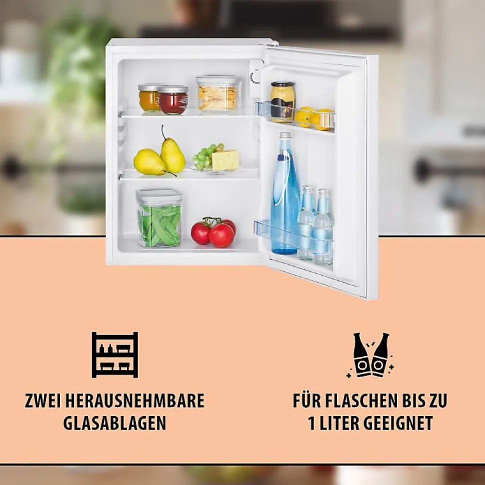 Un aménagement sur mesure pour vos besoins : grâce à ses deux étagères en verre amovibles et sa porte réversible, ce réfrigérateur s’adapte à vos envies. Sa plage de température précise et son design épuré en font un allié de choix pour une conservation efficace et accessible.CaractéristiquesCapacité nette : 58 litresRéglage progressif de la températurePlage de température : 0°C ~ +8°C2 étagères en verre, amovibles2 compartiments de porteArrêt de porte à droite, réversiblePieds réglablesDonnées techniquesTension d’alimentation : 220-240 V~ / 50 HzPuissance nominale : 60 WClasse climatique : N/ST (+16°C ~ +38°C)Liquide de refroidissement : R600aNiveau sonore : 39 dBDonnées de consommationConsommation d’énergie / 24 h : 0,222 kWhConsommation d’énergie / année : 81 kWh(conformément à la réglementation européenne sur les fiches de données 2019/2016)Données logistiquesDimensions de l’appareil : 63,2 x 47,0 x 45,0 cm (HxLxP)Emballage : 64,5 x 52,0 x 46,5 cm (HxLxP)Poids net : 16,5 kgPoids brut : 18,0 kg