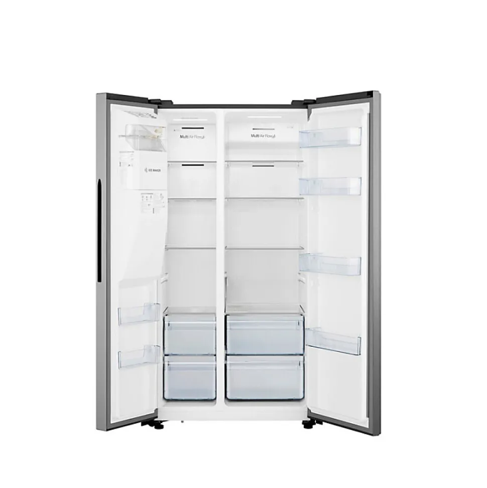 Réfrigérateur américain Hisense RS5P535NPCECaracteristiques principales : Classe énergétique : E.Consommation d’énergie annuelle : 324 kWh.Catégorie de niveau sonore : C.Niveau sonore : 39 dB.Volume du congélateur : 190 l.Volume du réfrigérateur : 376 l.Volume total : 566 l.Type de pose : Pose libre.Nombre de porte : 1.Fonctionnalité appareil du froid : Affichage de la température, Un modèle avec distributeur, Super congélation, Fabrique à glace amovible.Autonomie en cas de coupure : 6 h.Nombre de clayettes : 3.Type de clayettes : verre sécurité.Couleur : Inox.Dégivrage du réfrigérateur : Automatique.Type de réfrigération : Froid ventilé.Type de congélation : Froid ventilé.Pouvoir de congélation : 12 KG24H.Dégivrage du congélateur : Automatique.Nombre de tiroirs : 2.Distributeur : Eau, Glace pilée, Glaçons.Coût estimé d’utilisation annuel : 74 Euros.Classe climatique : SN, N, ST, T.Type de porte (cave) : Pleine.Ouverture de la porte : A droite.Porte réversible : Non.Caractéristiques complémentaires : Le compartiment congélateur peut être passé en mode réfrigérateur en appuyant 5 secondes sur la touche dédiée ConvertActive.Hauteur : 178,6 cm.Largeur : 91,5 cm.Profondeur du produit : 70,3 cm.Poids : 102,5 kg.Type de fixation : Sur charnières.Pays de fabrication : Serbie.Origine de fabrication : Fabriqué en Europe.Disponibilité des pièces détachées : 10 ans.Points forts : Volume 566 L – Dimensions (HxLxP) : 178.6×91.5×67 – Classe E – 39 dB.Froid ventilé NoFrost Multi AirFlow 376 L.Congélateur à dégivrage automatique 190 L – Distributeur d’eau fraîche sur réservoir.Fonction ConvertActive : convertit le congélateur en réfrigérateur.Caracteristiques principales :