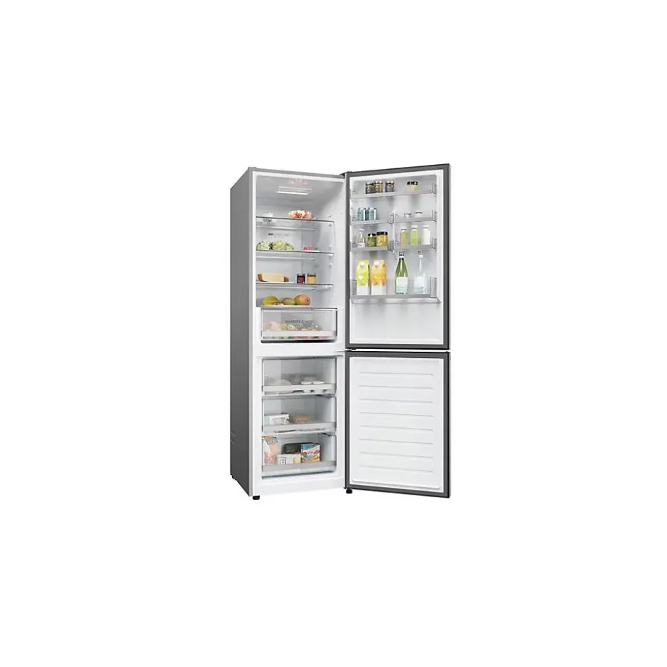 Réfrigérateur combiné Total No-Frost – Réfrigérateur No-Frost : 222 L – Avec la technologie Total No-Frost Air Surround, l’air circule dans le réfrigérateur de façon homogène. Ce système permet de préserver la fraicheur et le goût des aliments – Fonction Super Réfrigération – Clayettes verre – Eclairage LED – Le bac à légumes Humidity Zone garantit un taux d’humidité de 90% tout en laissant circuler l’air. Vous préservez ainsi à la perfection les qualités nutritionnelles de vos fruits et légumes. Cette technologie assure une conservation optimale – Congélateur No-Frost : 119 L – 3 tiroirs – Fonction Congélation rapide – Commande électronique interne – Fonction Vacances – Connecté WiFi : la connectivité fonctionne avec l’application hOn vous offrant une expérience d’usage inédite, comprenant vos besoins et les anticipant. Votre réfrigérateur s’adapte à vos besoins pour une meilleure préservation de vos aliments visuelles et sonores – Poignées intégrées – Finition Effet inox.Référence fournisseur H1DWDNPK186Code EAN 8059019057071Nomenclature douanière 84182199Largeur 59,5 cmHauteur 185 cmVolume (total) 341 LVolume (réf.) 222 LVolume (cong.) 119 LType de froid Total No-FrostNombre de compresseurs 1Nombre de circuits 2Régulation électroniqueAffichage T° nonDistributeur d’eau sansPouvoir de congélation 8 Kg/24HAutonomie 10 heuresClasse climatique N-STConnecté ouiLabels et points clésLabel énergie DConso élec. 204 kWh / anCatégorie sonore CNiveau sonore 37 dBLe + produit Sa connectivité fonctionne avec l’application hOn vous offrant une expérience d’usage inédite !Dimensions (LxHxP) 59,5 x 185 x 65,8 cmPoids net 69,5 KgColoris silverPorte(s) réversible(s) ouiLieu de fabrication Roumanie