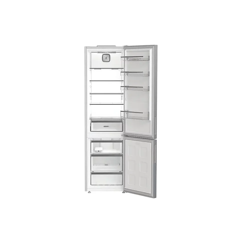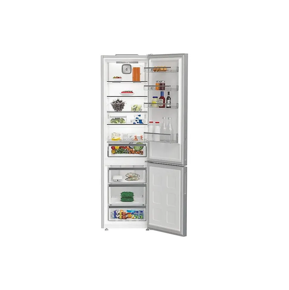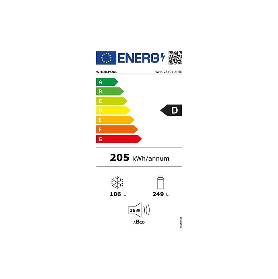 Réfrigérateur combiné Whirlpool WHK25404XP5E 355 L (249 L réfrigérateur + 106 L congélateur) en inox ; Dual No Frost (deux circuits) pour éviter le givre et le mélange d’odeurs ; ProFresh pour régulation d’humidité ; froid ventilé, dégivrage automatique ; 4 clayettes en verre (3 réglables), 2 bacs à légumes, 4 balconnets ajustables ; congélateur 4* avec 3 tiroirs, congélation 6 kg/24 h et autonomie 11 h ; thermostat électronique interne, éclairage intérieur, alarme porte ouverte, poignées intégrées, portes réversibles, pieds avant réglables ; consommation 205 kWh/an (classe D), niveau sonore 35 dB.