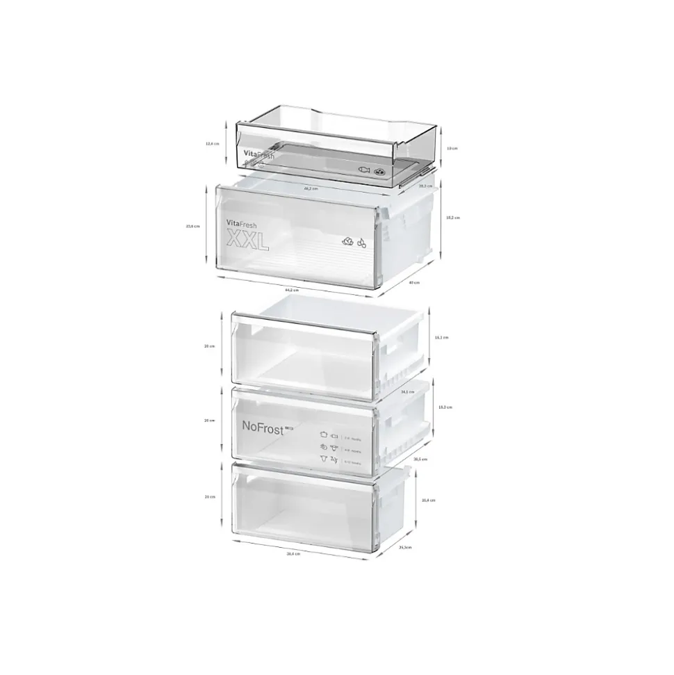 - VitaFresh 0-3°C avec contrôle d’humidité pour une conservation prolongée; No Frost (froid ventilé) pour zéro dégivrage