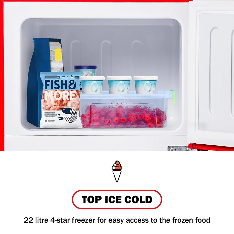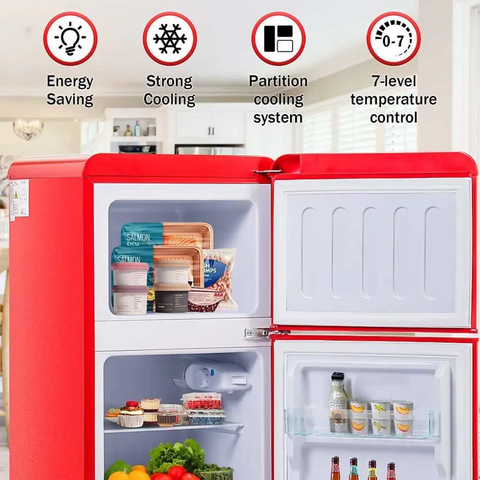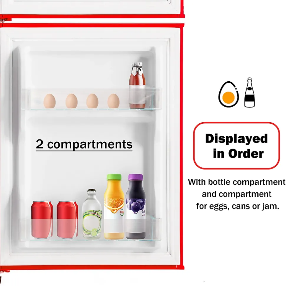 1. Design compact à deux portes : Ce réfrigérateur rouge à double porte arbore un style rétro moderne et compact, parfait pour les espaces comme le salon, la cuisine ou à côté du canapé. Il est idéal en tant que réfrigérateur d’appoint pour conserver boissons et snacks à portée de main. Avec une capacité de 60 litres et un éclairage LED anti-éblouissement, il combine esthétique et fonctionnalité.2. Haute efficacité énergétique : Ce réfrigérateur rouge est classé en classe énergétique E selon les dernières normes européennes. Il est équipé d’un congélateur 4 étoiles et consomme seulement 102 kWh par an avec un niveau sonore de 45 dB. Le réfrigérant R600a et le compresseur puissant assurent un refroidissement performant, avec une plage de température allant de -27°C à 13°C.3. Agencement intérieur flexible : Le compartiment de réfrigération offre 38 litres de capacité et comprend une clayette pour les œufs et un espace dédié aux bouteilles dans la porte. Les deux étagères internes sont ajustables pour s’adapter aux différents besoins de stockage, optimisant ainsi l’organisation.4. Compartiments séparés : Ce réfrigérateur dispose d’un compartiment congélateur distinct du compartiment de réfrigération, évitant tout mélange d’odeurs entre les aliments. Cette conception favorise une meilleure conservation, une hygiène accrue et une utilisation plus pratique pour l’organisation et le nettoyage.spécification:Dimensions du produit : 88,8 x 45,5 x 42,5 cmConsommation annuelle d’énergie : 102 kWh/anBruit : 45 dBCapacité totale : 60 LCompartiment congélateur : 22LCompartiment réfrigéré : 38LClasse d’efficacité énergétique : EPoids net : 17 kgPoids brut : 19 kg⚠️ ⚠️ Attention :1.Afin de limiter les retours et de réduire le gaspillage des ressources, nous vous invitons à vérifier avant l’achat que l’espace prévu pour l’installation du réfrigérateur est adapté.2.Les images sont présentées à titre indicatif. Veuillez vous référer aux dimensions réelles du produit.