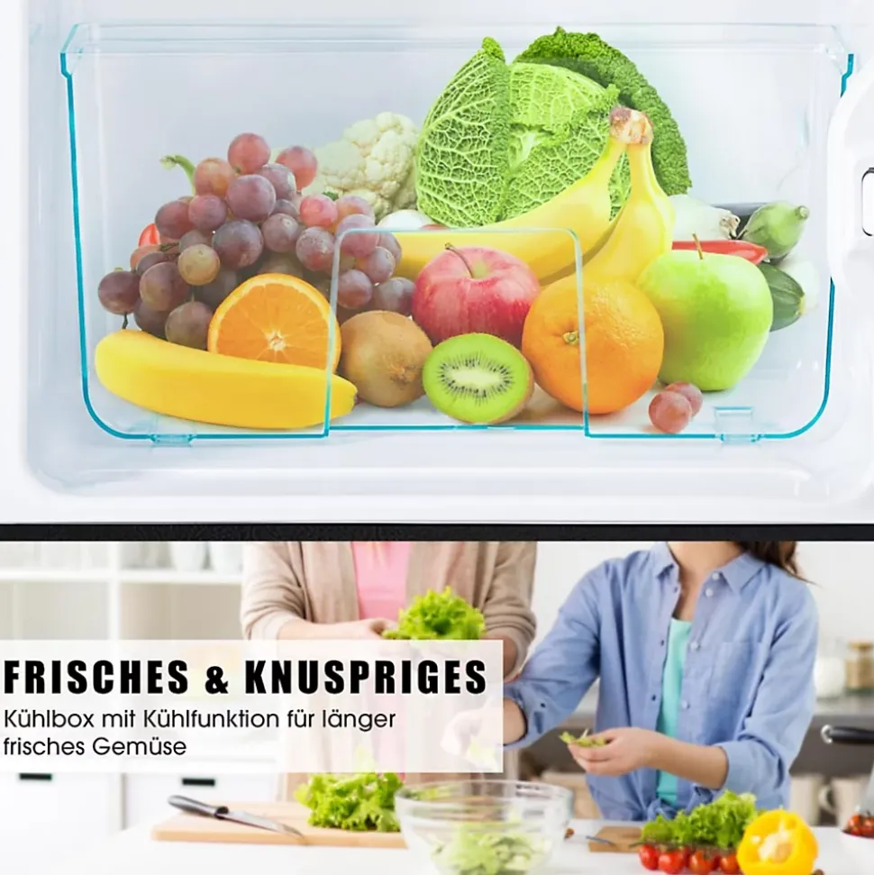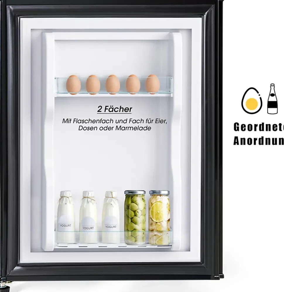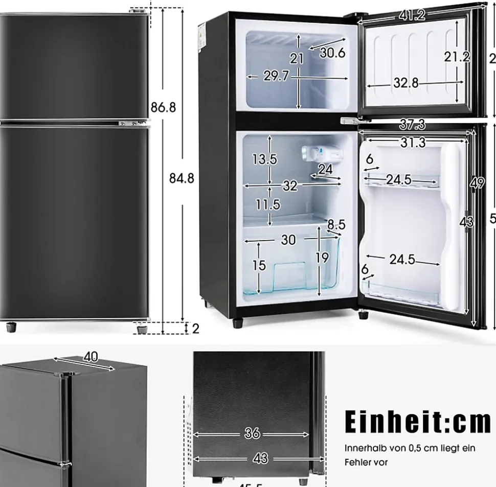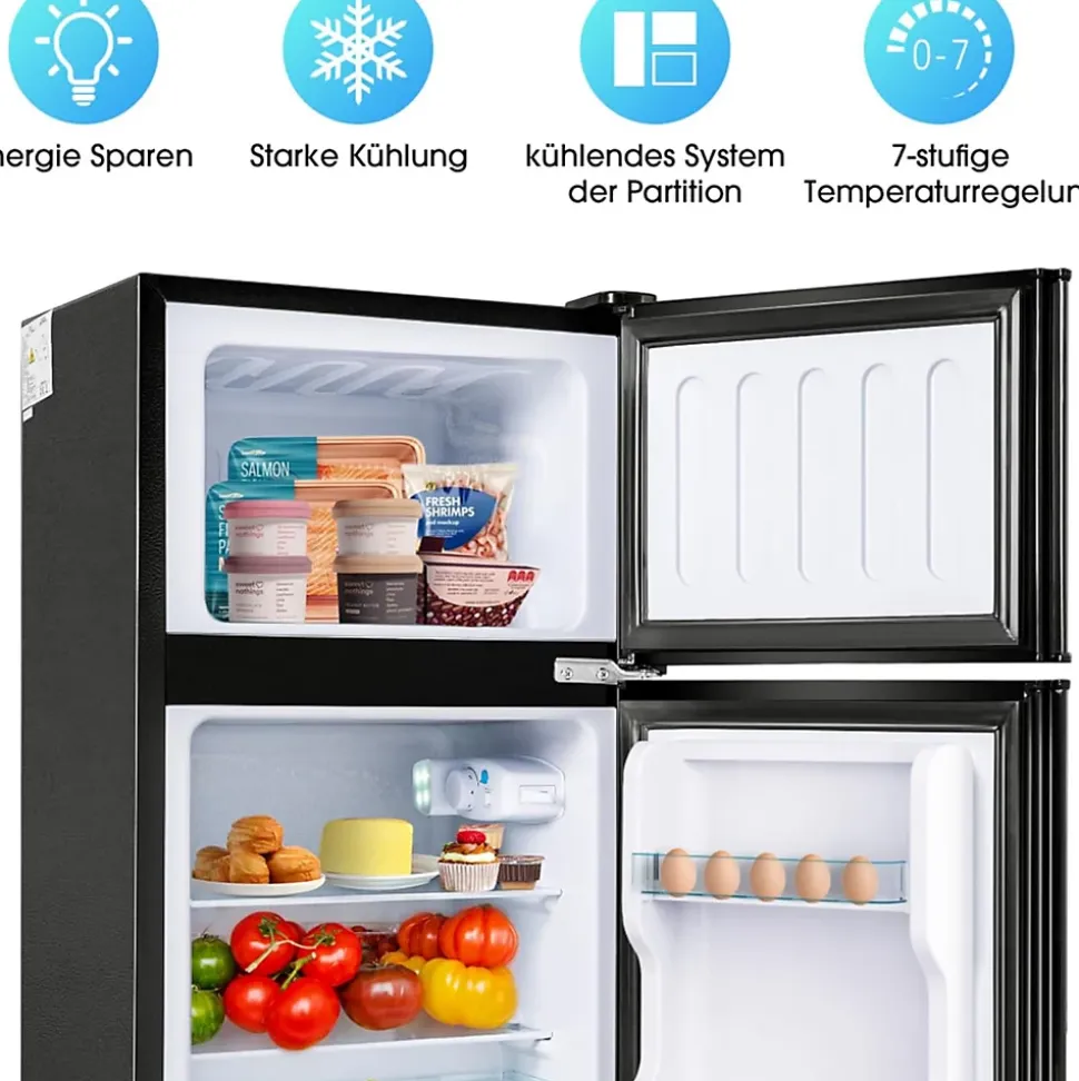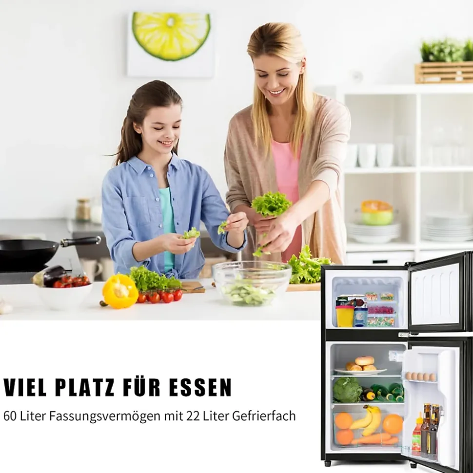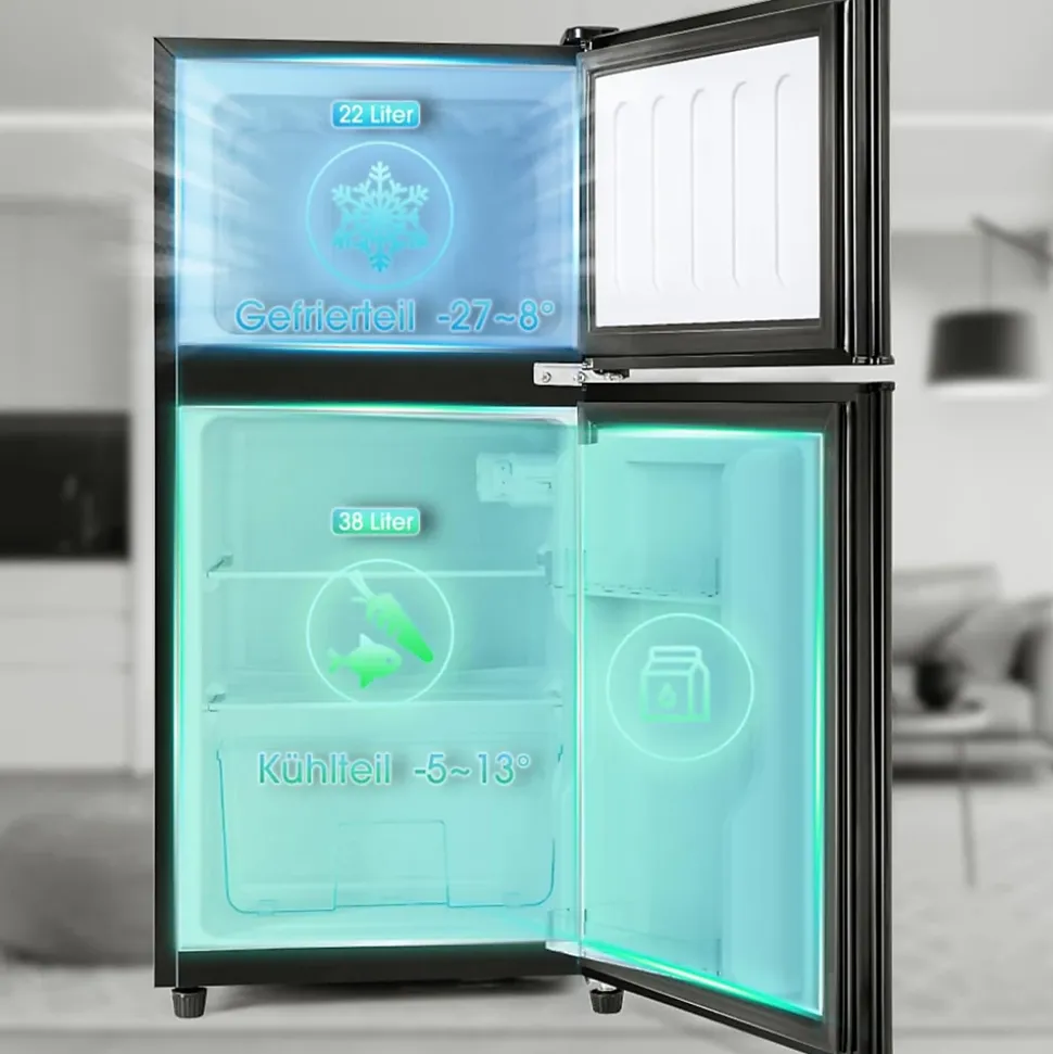Style à deux portes : ce réfrigérateur à deux portes a un aspect compact et cool pour représenter une sensation contemporaine et répondre aux diverses exigences. En tant que design compact et autonome, ce réfrigérateur noir à double porte pourrait être un réfrigérateur de secours pour stocker des boissons et des collations dans le salon, la cuisine ou à côté du canapé. L’intérieur a une capacité de 60 litres.Haute efficacité énergétique : ce réfrigérateur noir à deux portes est excellent en termes d’efficacité énergétique et est classé selon les dernières normes d’efficacité énergétique de classe E. Équipé d’un congélateur « 4 étoiles ». La consommation électrique de ce réfrigérateur à deux portes est de 172 kWh/an et l’émission sonore est de 35 dB. Ce réfrigérateur noir à deux portes utilise un réfrigérant environnemental R600a et des compresseurs puissants pour assurer d’excellentes performances.Capacité : 60 Litres (38L réfrigérateur + 22L congélateur)Dimensions du produit : 45,5 x 42,5 x 86,8 cmPoids : 17 kgConsommation électrique annuelle : 102 kWhType d’installation : AutonomeType de froid : Semi-automatiquePorte : DroiteFinition de porte : Acier inoxydableType de clayettes : Plastique (2 clayettes)Particularités : Résistant à la rayure, légère, congélateur séparé, sans gel, compacte, grande capacité, faible bruit, efficacité énergétiqueCouleur : NoirTension : 220 VoltsWatt : 10 WattsMatériau : Plastique, Acier inoxydableComposants inclus : 1 x RéfrigérateurPiles incluses ? : NonBatterie(s) requise(s) : Non⚠️ ⚠️ Attention :1. Les dimensions détaillées sont indiquées sur les images. Afin de limiter les retours et le gaspillage inutile, veuillez vérifier avant l’achat que l’espace prévu pour l’installation du réfrigérateur est adapté.2. Les aliments présentés sur les images sont uniquement à titre illustratif. Veuillez vous référer aux dimensions réelles du produit.
