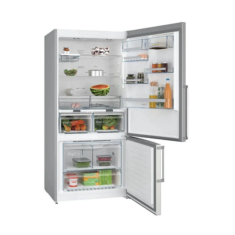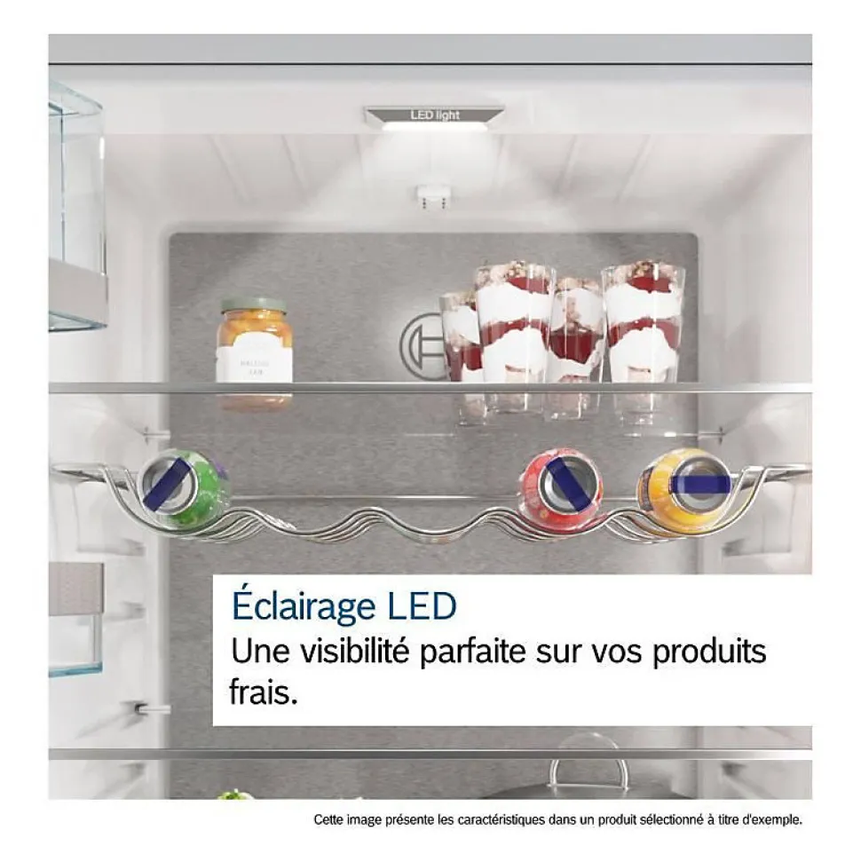 Réfrigérateur combiné 86cm 631l nofrost inox Bosch – Le réfrigérateur combiné Série 6 Bosch KGN86AIDR noFrost : conserve vos aliments frais plus longtemps. VitaFresh XXL : le tiroir extra-large avec humidité contrôlée spécialement conçu pour les fruits et légumes. No Frost : le dégivrage du réfrigérateur et du congélateur, c’est terminé. Capacité XXL : encore plus de place pour vos produits frais. Perfect Fit : installer votre réfrigérateur directement collé à un mur ou un autre appareil n’est plus un problème. Eclairage LED : éclairage uniforme de votre réfrigérateur, sans éblouissement. – Type de produit : Réfrigérateur combiné.Type de construction : Pose libre.Volume total : 631 l.Classe d’efficacité énergétique D sur une échelle allant de A à G.Consommation énergétique : 246 kWh/an.Pour atteindre la consommation d’énergie annoncée, les butées de ventilations jointes doivent être utilisées. En conséquence, la profondeur de l’appareil s’accroît d’environ 3,5 cm. L’appareil utilisé sans ces butées est parfaitement fonctionnel, mais a une consommation sensiblement plus élevée.NoFrost MultiAirflow.Portes inox-easyclean.Poignées verticales extérieures.Régulation électronique avec affichage LED de la température.Chaque zone de température contrôlable et réglable séparément.Eclairage LED à intensité progressive (SoftStart) dans le réfrigérateur.Alarme visuelle et sonore de porte ouverte.Réfrigérateur : Volume 479 l.Super-réfrigération avec arrêt automatique.3 clayettes en verre de sécurité (2 réglables en hauteur).1 grands et 3 petits balconnets.Support à bouteilles.2 compartiments VitaFresh Plus avec contrôle de l’humidité.les fruits et légumes restent frais et riches en vitamines jusqu’à 2 fois plus longtemps.2 compartiments VitaFresh Plus avec contrôle de la température et rail EasyAccess – les viandes et poissons restent frais jusqu’à 2 fois plus
