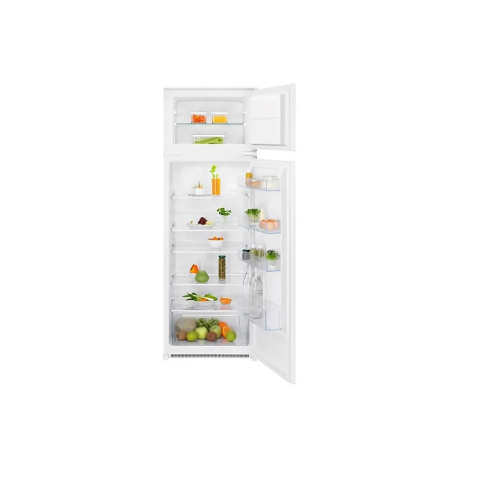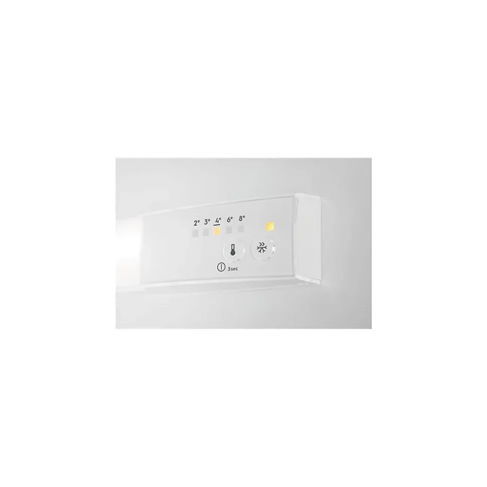 Réfrigérateur combiné encastrable à glissières 249l Electrolux – Réfrigérateur congélateur deux portes Série 500 KTS5LE16S de Electrolux.Récupération rapide de la température, pour une préservation des aliments à toute épreuve.La technologie ColdSense permet, après l’ouverture de la porte ou l’ajout d’aliments, de revenir à la bonne température, grâce à des capteurs électroniques. Cela permet d’éviter les chocs de température et la détérioration des aliments, en favorisant leur préservation totale.ColdSense protège les aliments en rétablissant rapidement la température.ColdSense utilise des capteurs de température précis pour ramener rapidement le réfrigérateur-congélateur à la bonne température après l’ouverture et la fermeture de la porte. Cela permet d’éviter les chocs de température et la détérioration des aliments, pour une protection totale des aliments. – Type de produit : Réfrigérateur combiné.Catégorie : Réfrigérateur-congélateur.Type d’installation : Glissières.Nouvelle classe énergétique : E.Volume net total (L) : 249.Volume net réfrigérateur (L) : 199.Volume net compartiment : 50 L.Niveau sonore (dB) : 33.Consommation électrique (kWh/an) : 194.Pouvoir de congélation : 6.1 Kg/24H.Autonomie : 13 heures.Classe climatique : SN-N-ST-T.Type de froid (réfrigérateur) : Froid statique.Congélateur : Froid statique / Low Frost.Dégivrage du congélateur : Manuel.Dégivrage du réfrigérateur : Automatique.Eclairage intérieur : LED.Nombre de compresseurs : 1.Nombre de circuits : 1.Régulation : électronique.Affichage T° : Oui.Alarme : Oui.Nombre clayettes : 4.Type de clayettes : Bordure en plastique blanc.1 clayette : En verre (dans la partie congélateur).Bac à légume : 1.Compartiment crèmerie : 1.Support(s) à oeufs : 1 pour 6 oeufs.Fonction super congélation : Oui.Porte(s) réversible(s) : Oui.Volts :