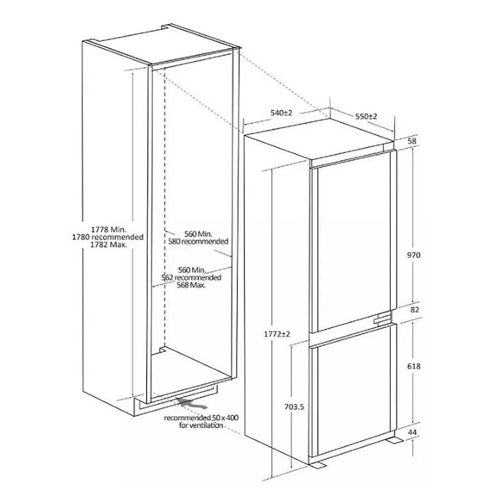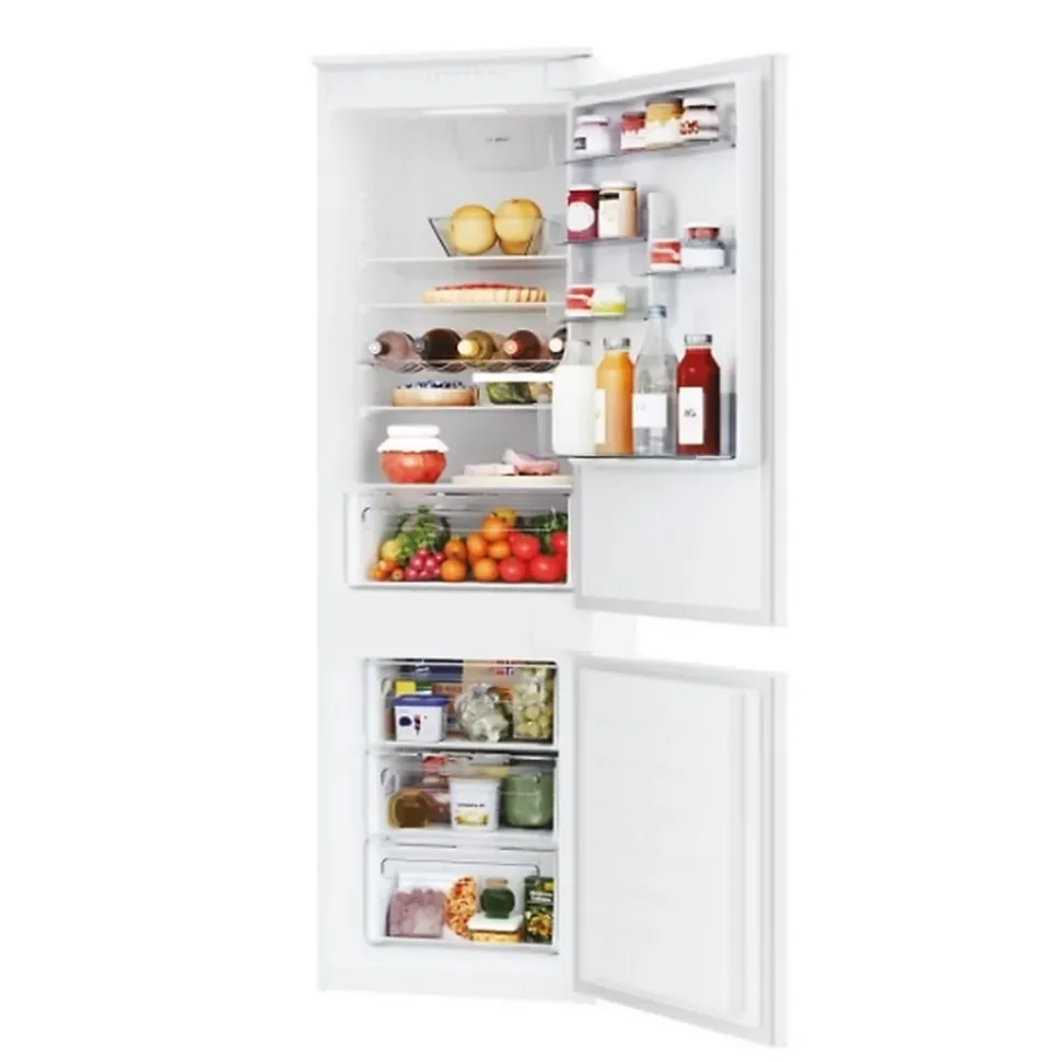 Alarme porte ouverte : OuiAutonomie (h) : 13Autre(s) équipement(s) : Bac à glaçonsCapacité : De 200 à 350 LClasse climatique : SN-ST. Cet appareil est conçu pour être utilisé à une température ambiante comprise entre 10°C et 38°CClasse d’efficacité énergétique : EClasse d’efficacité énergétique de la source lumineuse : GClasse d’émission de bruit acoustique dans l’air : BClasse énergétique : ECongélation rapide ou Super Congélation : OuiConso. d’énergie annuelle (kWh/an) : 220Couleur : IntégrableDégivrage congélateur : ManuelDimensions H x L x P (cm) : 177.2 x 54 x 55Dispositif de congélation rapide : NonDistributeur d’eau : NonEmissions de bruit acoustique dans l’air (dB(A)) : 35Encastrement H x L x P (cm) : 177.8-178.2 x 56-56.8 x 56Hauteur (cm) : 177.2Hauteur encastrement (cm) : 177.8IEE : 100Largeur (cm) : 54Largeur encastrement (cm) : 56Mode de dégivrage congélateur : ManuelMode de dégivrage réfrigérateur : AutomatiqueNbre de balconnets contre-porte : 5Nbre de clayette(s) réglable(s) : 3Nbre de tiroir(s) : 3Nbre total de clayette(s) : 4Poids (kg) : 56Porte à habiller : OuiPorte d’habillage fournie : Non (nécessite la pose d’une porte assortie à la cuisine)Porte réversible : OuiPosition du congélateur : BasPouvoir de congélation spécifique (kg/24h) : 3Profondeur (cm) : 55Profondeur encastrement (cm) : 56Réfrigérateur connecté : NonRéfrigération rapide ou Super Réfrigération : OuiRéglage hiver : NonRégulation de la température : ElectroniqueSystème de porte : GlissièreTechnologie froid congélateur : Low FrostType : Réfrigérateur combiné intégréType d’éclairage : LEDType de clayette(s) : VerreType de compresseur : InverterType de construction : IntégrableType de dégivrage : AutomatiqueType de froid du congélateur : StatiqueType de froid du réfrigérateur : BrasséType de poignée(s) : IntégréesType de source lumineuse : LEDType réfrigérateur : Réfrigérateur – Congélateur en basT°C recommandée pour stockage optimisé des denrées alimentaires dans compartiment 4 étoiles