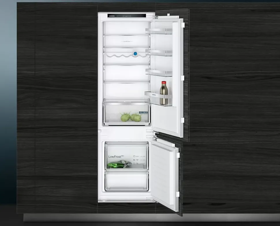 Le réfrigérateur combiné Siemens KI87VVFE1 est encastrable avec un volume total de 270 L (200 L réfrigérateur et 70 L congélateur). Il utilise un froid statique dans les deux compartiments, possède un dégivrage automatique pour le réfrigérateur et manuel pour le congélateur, et est équipé d’un affichage LED avec alarme de porte ouverte. Son design compact et intégrable s’adapte parfaitement à la cuisine. Classe énergétique E, consommation annuelle 216 kWh, niveau sonore 35 dB.