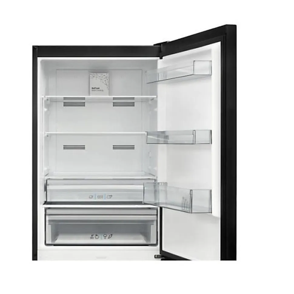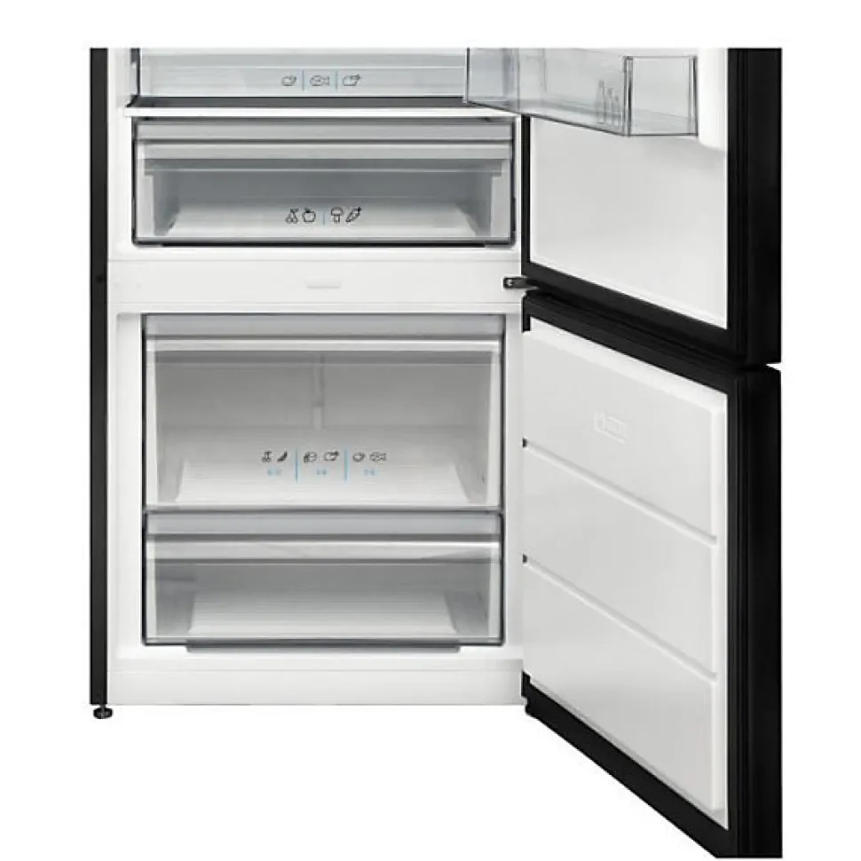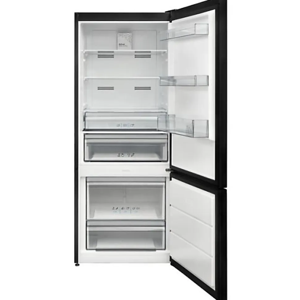 Réfrigérateur congélateur bas CONTINENTAL EDISON CEFC428NFBD, 427 L (313 L réfrigérateur / 115 L congélateur) No Frost ventilé multicooling, dégivrage automatique, congélation rapide, classe D, 39 dB, finition noire mate, 2 portes, 2 clayettes, tiroirs et compartiments de porte, alarme de porte et éclairage intérieur.