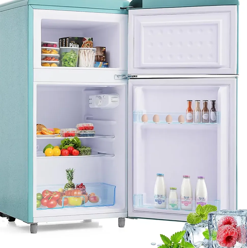 1. Apportez une touche de style rétro à votre cuisine tout en profitant des fonctionnalités modernes avec ce réfrigérateur à double porte. Avec une capacité totale de 72 litres, il est parfait pour les petits espaces ou les familles nécessitant un espace de stockage supplémentaire. Le congélateur de 21 litres situé sur la partie supérieure et l’espace réfrigérateur de 51 litres vous permettent de stocker vos aliments frais et congelés avec facilité.2. Le design rétro, disponible en 4 couleurs, s’adapte parfaitement à différents styles de cuisine, ajoutant une touche de charme tout en restant pratique. Les poignées des portes du haut et du bas sont non seulement fonctionnelles, mais apportent aussi une touche esthétique et élégante.3. À l’intérieur, vous trouverez trois étagères ajustables pour organiser vos produits alimentaires de manière optimale. Un support à œufs est intégré dans la porte inférieure pour plus de commodité. De plus, ce réfrigérateur est équipé de pieds réglables qui assurent une stabilité parfaite et un placement horizontal.4. Il dispose également d’un thermostat réglable vous permettant d’ajuster facilement la température en fonction de vos besoins. Que vous ayez besoin d’un réfrigérateur plus froid ou d’un congélateur plus performant, il vous suffit de tourner le bouton pour ajuster la température selon vos préférences.5. Avec des dimensions compactes et un poids raisonnable de 18,8 kg, ce réfrigérateur s’intègre parfaitement dans votre cuisine, même dans les espaces les plus réduits. La livraison est facile grâce à ses dimensions d’emballage (95,8 x 51 x 50 cm) et son poids de 21,5 kg.Caractéristiques principales :Capacité totale de 72LCongélateur de 21L3 étagères ajustablesPoignée design rétroSupport à œufs intégréThermostat réglablePieds réglables pour plus de stabilité4 couleurs disponibles pour s’adapter à votre décor