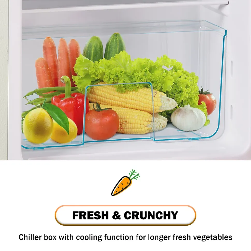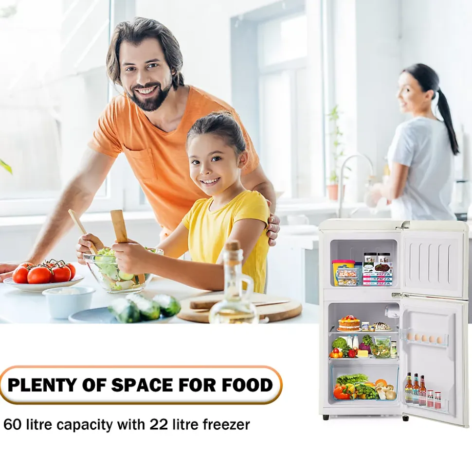 &Description du produit&1. Design compact et polyvalentRéfrigérateur deux portes au design moderne et épuré. Compact et autoportant, il est idéal comme réfrigérateur d’appoint pour boissons et en-cas, que ce soit dans la cuisine, le salon ou près du canapé. Capacité totale de 60 L avec éclairage LED doux.2. Haute efficacité énergétiqueClassé E selon les dernières normes d’efficacité énergétique, avec un congélateur 4 étoiles. Consommation annuelle de seulement 102 kWh, niveau sonore réduit à 45 dB, fluide frigorigène R600a et compresseur performant.3. Température réglable et performances fiablesPlage de température réglable de -27 °C à 13 °C, permettant une conservation optimale de tous types d’aliments, du surgelé aux produits frais.4. Aménagement intérieur flexibleCompartiment réfrigérateur de 38 L équipé de supports pour œufs et bouteilles. Les deux clayettes réglables permettent d’adapter l’espace selon vos besoins.5. Deux compartiments séparés pour une meilleure hygièneCongélateur et réfrigérateur indépendants pour éviter le mélange des saveurs. Nettoyage et organisation facilités, avec pieds réglables assurant une parfaite stabilité sur tous types de sols.&Détails&● Dimensions du produit : 88,8 x 45,5 x 42 cm● Dimensions de l’emballage : 98 x 51 x 48,5 cm● Consommation énergétique annuelle : 102 kWh/an● Niveau sonore : 45 dB● Capacité totale : 60 L● Compartiment congélateur : 22 L● Compartiment réfrigérateur : 38 L● Classe énergétique : E● Poids net : 17 kg● Poids brut : 19 kg⚠️ ⚠️ Attention :1.Afin de limiter les retours et de réduire le gaspillage des ressources, nous vous invitons à vérifier avant l’achat que l’espace prévu pour l’installation du réfrigérateur est adapté.2.Les images sont présentées à titre indicatif. Veuillez vous référer aux dimensions réelles du produit.