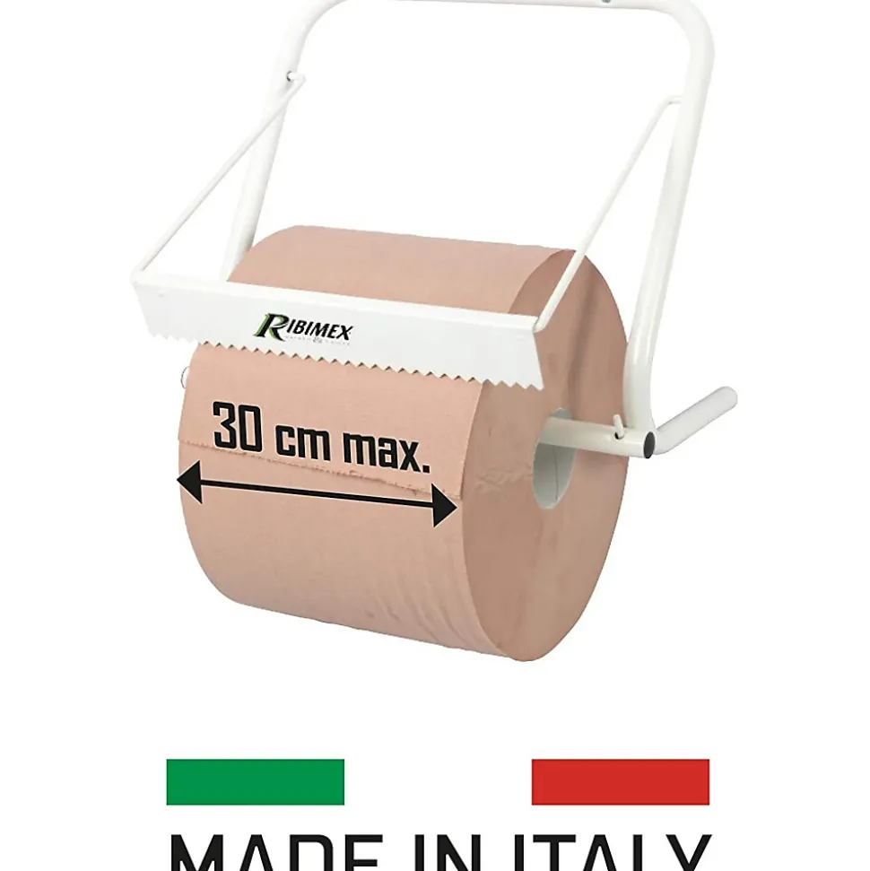 Dévidoir papier en acier blanc pour toute bobine d’essuyage 30cm max. Idéal pour les garages, les chantiers, ateliers de maintenance et d’entretien…Livré sans papier.Dévidoir mural dérouleur porte essuie toutPour plus d’hygiène, utilisez un dérouleur d’essuie tout mural plutôt que de laisser votre rouleau de papier posé à même le sol.Ce dérouleur de papier essuie tout vous permet d’avoir toujours à portée de main de quoi vous essuyer.Idéal pour l’atelier ou le garage, ce dévidoir mural évite le gaspillage grâce à sa barre de coupe munie de 30 dents qui tranchent net.Informations techniquesMatière : métal.Dimensions :Hauteur : 30 cmLongeur : 35 cmLargeur : 21 cmBarre de coupe : 30 cmColoris : blanc.Installation :Se fixe au murKit de fixation fourni : 2 vis et 2 chevillesComporte 2 embouts noirs pour amortir les chocs contre le mur.Livré sans rouleau essuie tout….