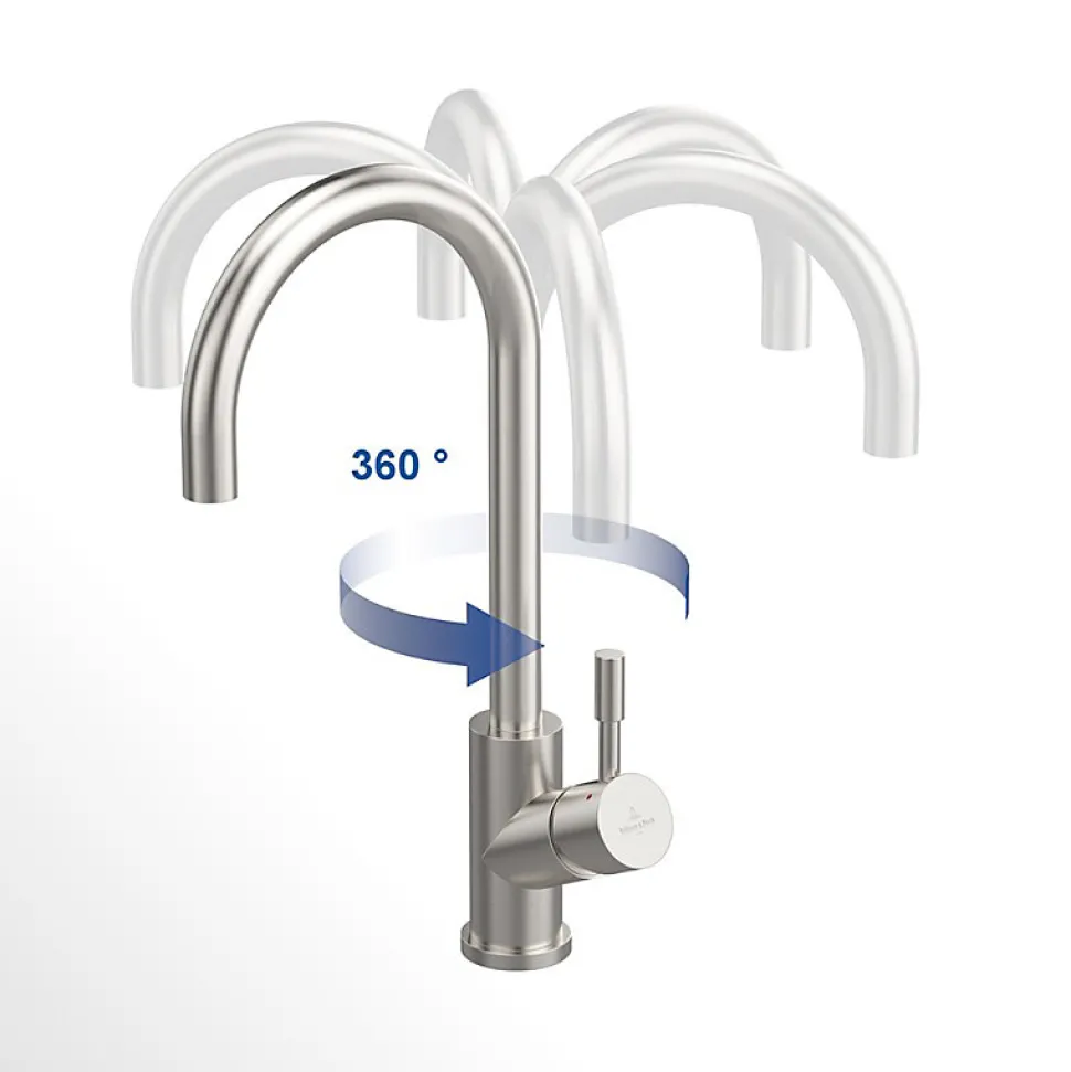 - Bec haut pivotant à 360° : confort optimal, parfaitement adapté aux éviers simples ou doubles.