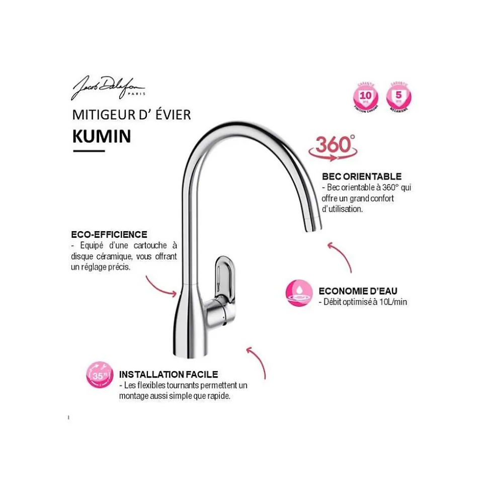Les avantages de votre robinet de cuisine JACOB DELAFON KuminConfort d’utilisation avec une hauteur sous aérateur adaptée aux usages intensifsBec tube orientable à 360° pour une grande liberté de mouvementÉconomie d’eau grâce au limiteur de débit sensitifSécurité renforcée par un limiteur de température intégréAérateur anticalcaire pour un entretien simplifiéInstallation rapide avec flexibles tournants G3/8Les caractéristiques produits de votre robinet de cuisine JACOB DELAFON KuminType : mitigeur de cuisine mécanique.Collection : KUMIN.Référence : E99477.Couleur : chrome.Type d’installation : monotrou.Percement : Ø 35 mm.Hauteur totale : 350 mm.Hauteur sous aérateur : 228 mm.Saillie du bec : 227 mm.Type de bec : tube pivotant.Orientation du bec : 360°.Débit : 10 L/min sous 3 bars.Consommation d’eau : limiteur de débit sensitif.Mécanisme : cartouche à disques céramique.Raccordement : livré avec flexibles d’alimentation.Vidage : sans.Normes : ACS – NF ECAU E0 C3 A2 U3 (Ge5).Poids : 2,4 kg.Garantie : 5 ans.Éco-conception : oui.La fiche technique est disponible en pièce jointe