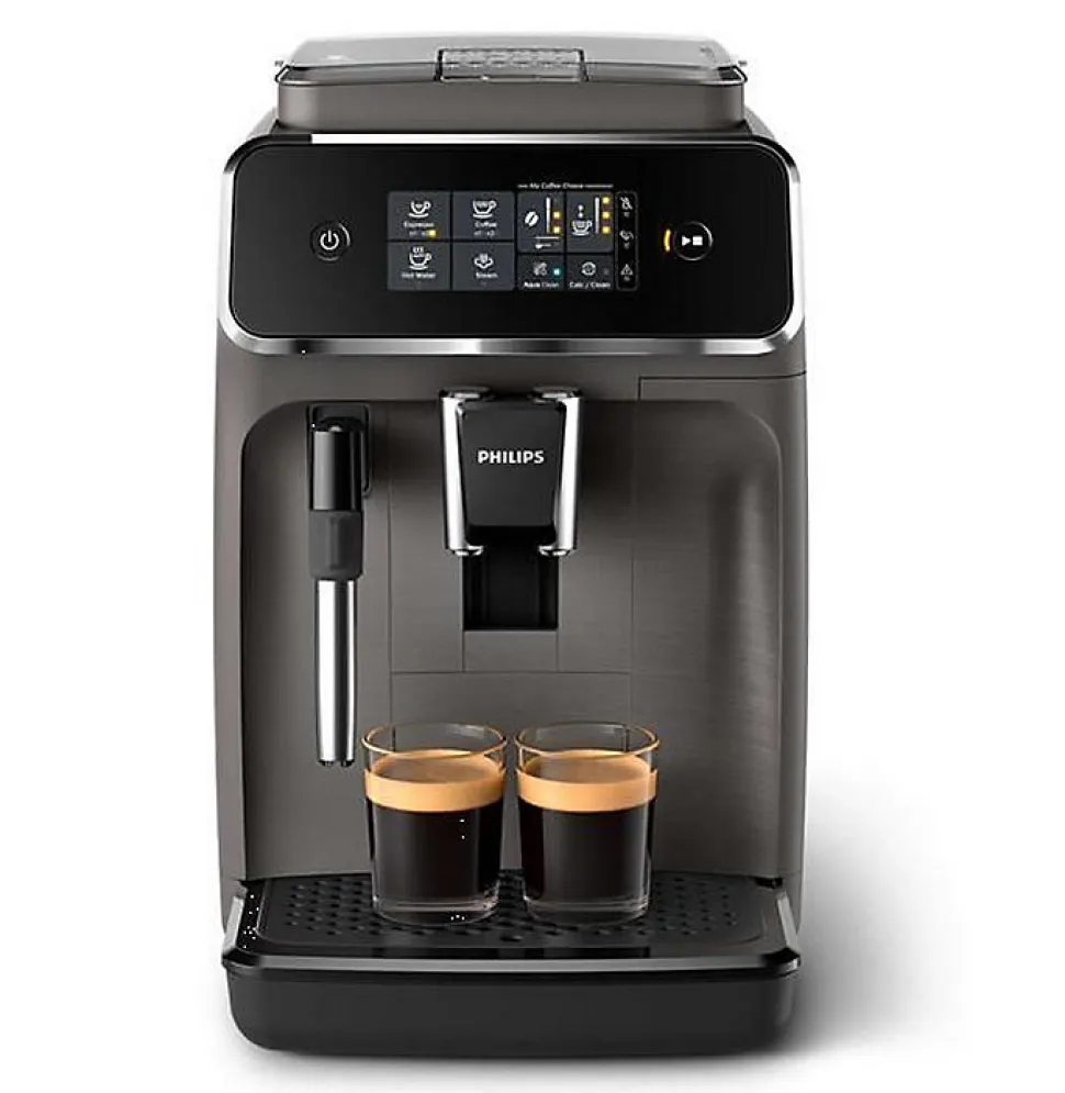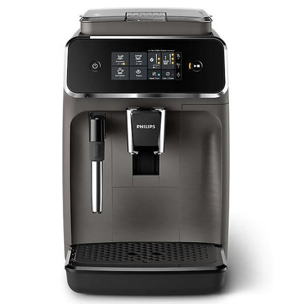 Machine à café entièrement automatique Philips EP2224.10 Série 2200. Préparez espresso, café et eau chaude avec une personnalisation facile via écran tactile. Broyeur en céramique 12 niveaux, mousseur à lait classique, filtre AquaClean pour 5000 tasses sans détartrage. Réservoir d’eau 1,8 L, bac à grains 275 g, groupe café amovible et nettoyage simplifié. Label énergétique A et design gris cachemire élégant. Puissance 1500 W, pompe 15 bars, garantie 2 ans.