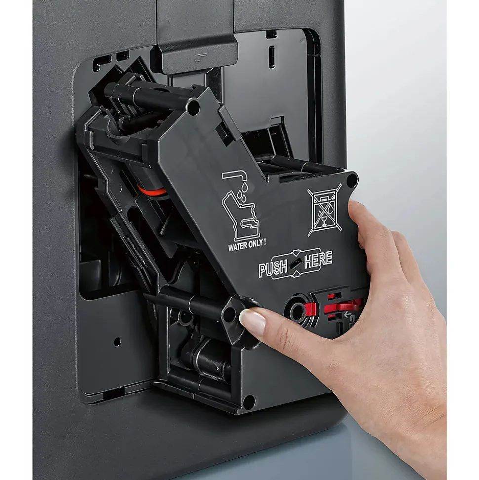 Robot café 19bars inox foncé Siemens – Un design élégant, au-delà des fonctionnalitésSiemens est synonyme d’un design qui va au-delà de l’évidence. Le design épuré et dynamique promet des fonctionnalités en harmonie avec des formes esthétiques et des matériaux triés sur le volet. Le style clair des machines à café à grains de Siemens leur confère une élégance et un sens de la qualité distinctifs grâce à leurs matériaux et leur apparence raffinés. Leur forme dynamique et leur conception sans faille à 360° les rendent parfaites pour chaque cuisine.Nettoyage automatique du système de laitPréparer un café parfait est un plaisir. Siemens a développé la fonction autoMilk Clean pour un maximum de confort. Ce processus de nettoyage à la vapeur des composants du système de lait, totalement automatique, fonctionne après chaque boisson, sans manipulation par l’utilisateur. Le processus élimine les résidus de lait et garantit un niveau d’hygiène élevé. La meilleure façon d’assurer votre bien-être et le plaisir de chaque tasse de café.Un café extra corsé avec aromaDouble Shot.Créer un excellent arôme est un art et Siemens est passé maître dans ce domaine. Avec la fonction aromaDouble Shot novatrice – un double processus automatique de mouture et de percolation – vous créez toujours un café fort sans compromettre l’arôme. L’arrière-goût amer est automatiquement atténué, car en utilisant moins d’eau et un temps d’extraction plus court, le café libère également moins de substances amères. Seul le meilleur des grains se retrouve dans votre tasse.Des grains parfaitements moulus pour un goût parfaitDes grains fraichement moulus de manière uniformes sont essentiels pour un arôme parfait. Le moulin en céramique Siemens de haute qualité moud les grains de café de manière homogène, ce qui permet aux différents arômes de se développer pour une expérience de café exceptionnellement aromatique. La céramique étant pratiquement inusable, la dégustation d’un