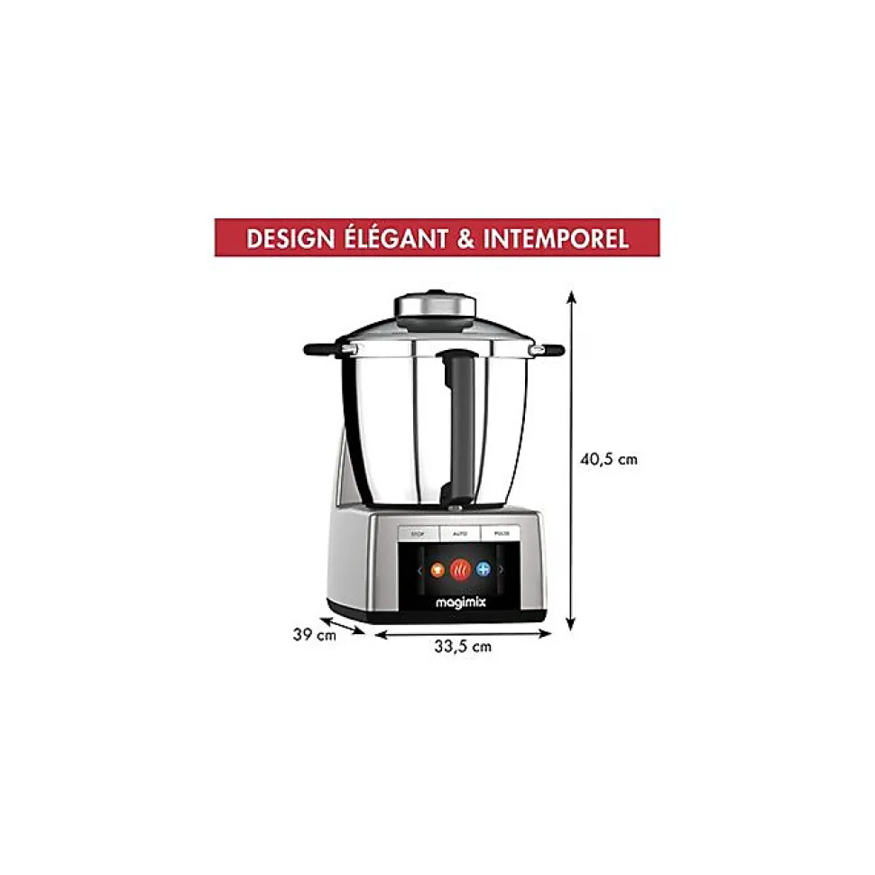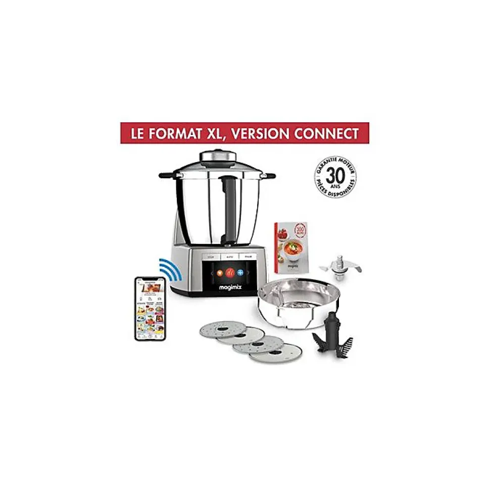 Le robot cuiseur Cook Expert XL Connect Platine de MAGIMIX est équipé d’un bol inox grande capacité de 4,8 L et d’un panier vapeur XL de 3,5 L. Il dispose également de 3 bols multifonction pour râper, émincer, hacher, mixer, etc. Son moteur de 1800 W et ses 18 vitesses vous permettent de réaliser toutes vos préparations culinaires avec facilité.