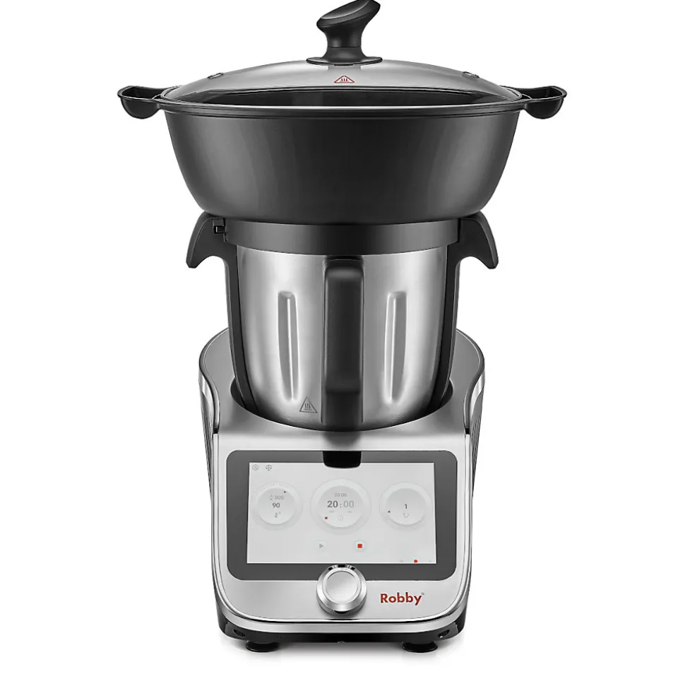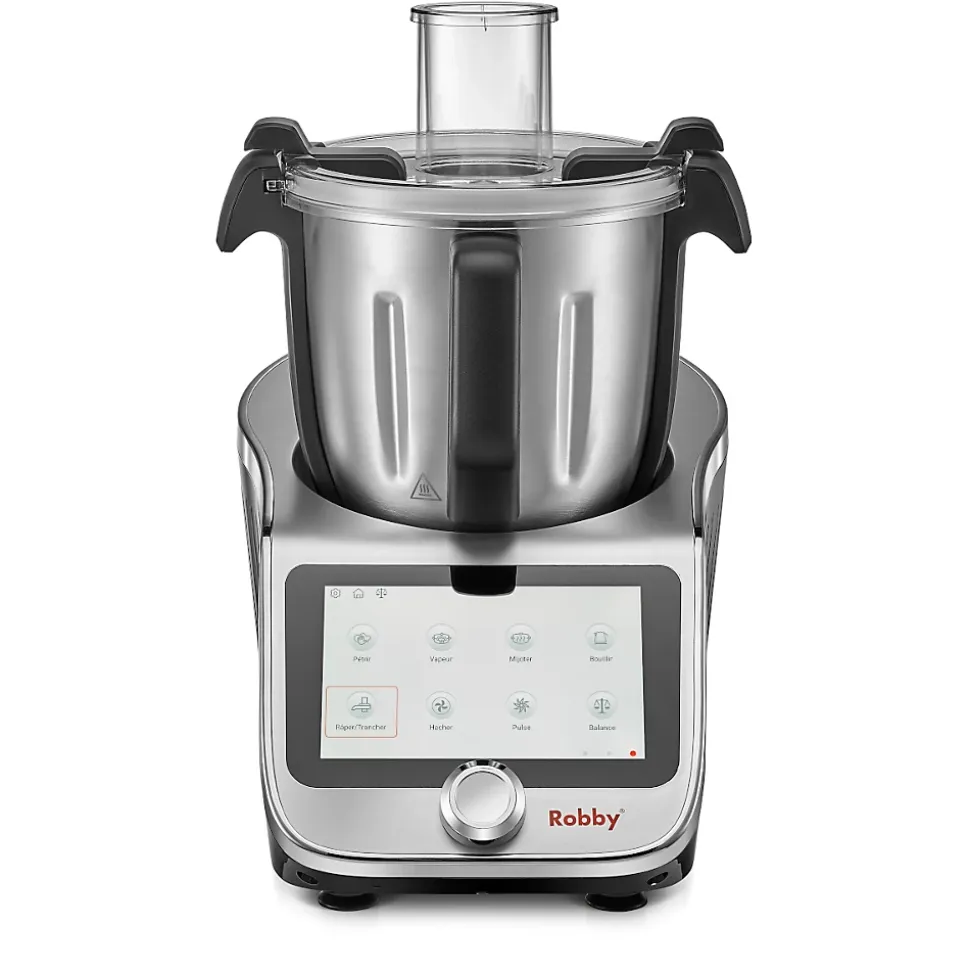 Robot cuiseur multifonctions connecté avec bol xl, balance intégrée et grand écran tactile +750 recettes Robby – Le RobiCook XL est le grand frère du Robicook, robot cuiseur multifonctions dernière génération de la gamme Robby !Conçu pour régaler toute la famille jusqu’à 8 personnes, plus de 750 recettes sont incluses : à réaliser en toute simplicité grâce à son écran tactile qui vous guide pas à pas !Une multitude d’accessoires sont inclus pour une infinité de recettes !La fonction pesée au gramme près est également incluse dans le RobiCook !Doté d’un grand écran couleur haute définition tactile et d’un bouton de navigation ergonomique, le RobiCook XL vous permettra de gérer facilement vos recettes.Vous naviguez facilement à travers toutes les recettes et fonctionnalités de l’appareil : apéritifs, entrées, soupes, plats de viande, plats de poisson, accompagnements, pâtes, riz et céréales, quiches, tartes et pizzas, sauces et dips, pains et viennoiseries, confitures et tartinades sucrées, desserts et crèmes, pâtisseries, boissons, recettes végétariennes, recettes express, recettes light…Équipé d’une véritable interface connectée, votre RobiCook XL se connecte au wifi pour bénéficier de mises à jour, ainsi que de nouvelles recettes par exemple ! Votre RobiCook XL ne cessera donc d’évoluer !Vous ne savez pas quoi cuisiner avec ce qu’il y a dans votre réfrigérateur ?Entrez le nom de l’aliment dans la barre de recherche et le RobiCook XL vous propose des recettes incluant cet aliment !Vous souhaitez retrouver facilement vos recettes préférées ?Ajoutez-les dans vos favoris afin de vous constituer votre bibliothèque de recettes personnalisées.Envie de plus de liberté ?Un mode manuel est également disponible dès l’allumage de votre appareil !Accédez rapidement aux programmes automatiquesAccès direct sur le menu de l’écran : pétrir, vapeur, mijoter, bouillir, mixer, râper/trancher et hacher…8 PROGRAMMES AUTOMATIQUESAccédez rapidement aux fonctions essentielles en