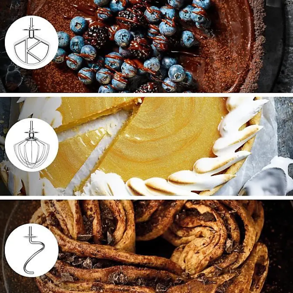 - Inclus : fouet, crochet pétrin, K-Beater et spatule