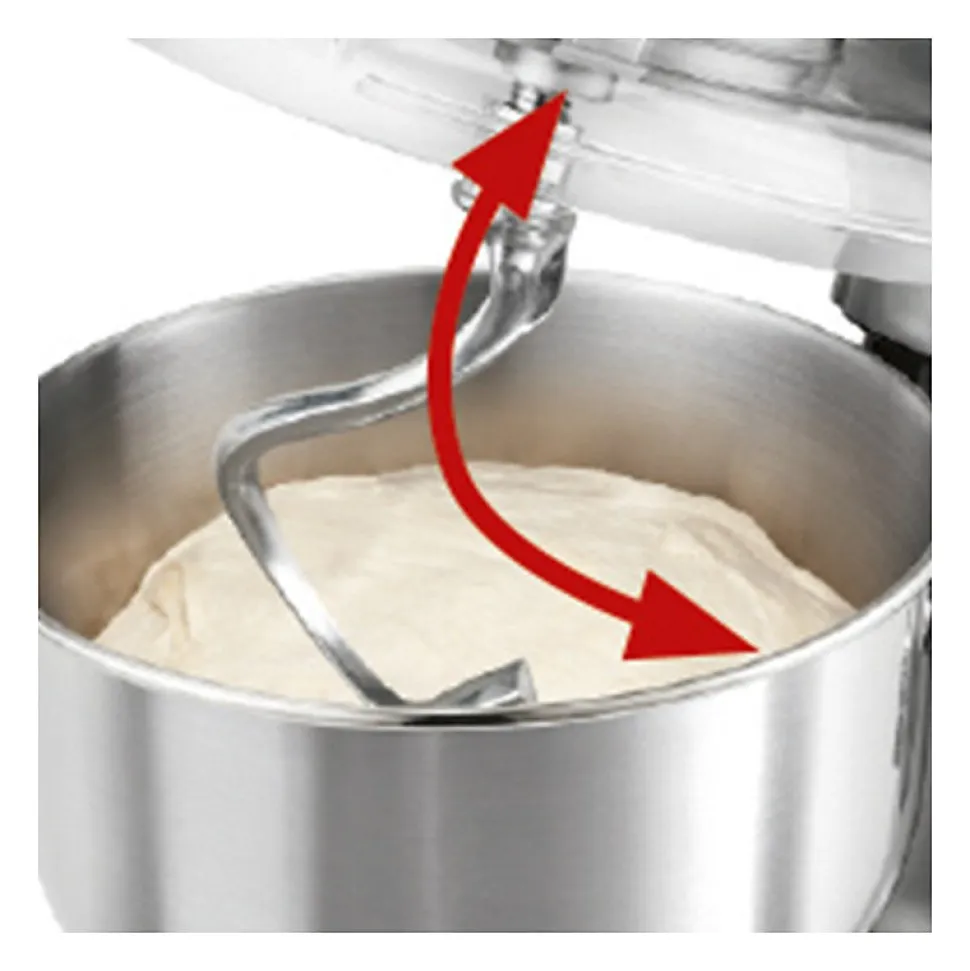 Pétrin haute performance avec une puissance supplémentaire de 1200 wattsFonction de minuterie électronique / écran LCD (éclairage bleu)Performance constante grâce à la rotation électronique en fonction de la chargecontrôle de la vitesse10 niveaux de vitesse (0/1/2/3/4/5/6/7/8 + fonction pulse)Démarrage progressif pour un mélange lentBol en acier inoxydable de 6,2 litres pour la préparation de pâtes de max. 3-3,5 kg de pâteRécipient de mélange en verre avec graduation et orifice de remplissage (1,5 litres)Crochet mélangeur en aluminium moulé sous pression – pour les pâtes légères comme les pâtes courtes,pâte à crumble ou mélange de génoisesCrochet à pâte en aluminium moulé sous pression – pour les pâtes lourdes comme la pâte à levure, la pâte à painou pâte à pâtesFouet en acier inoxydable pour monter le blanc d’?uf, la crème, la meringue et bien d’autres choses encore.Engrenage spécial robusteBras multifonctions pivotant à 35° avec mécanisme de déverrouillageCouvercle transparent anti-éclaboussures avec ouverture pour la recharge (amovible)Circuit de sécurité – la machine s’arrête lorsqu’on soulève le brasParticulièrement facile à utiliser et à nettoyerSupport sûr grâce aux pieds à ventouseMandrin à action rapide pour le maintien des outilsHachoirCoupeur en acier inoxydable, col en métal, vis d’alimentation en métal, bac de recharge en métal, 3 disques de hachage en acier inoxydable3 disques de hachage en acier inoxydable, accessoire pour pâtisserie, accessoire pour remplissage de saucisses, accessoire pour kebbe.Fonction pâtesFaites des pâtes vous-même avec 3 accessoires différents pour les spaghettis, les macaronis,tagliatelles220-240 V, 50/60 Hz, 1200 W
