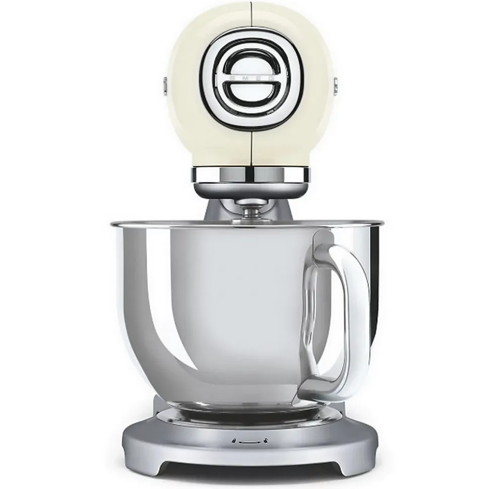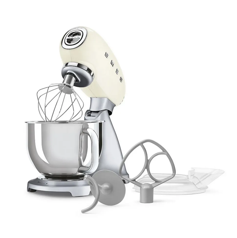 Robot pâtissier multifonctions 4.8l 800w crème Smeg – Robot sur socle Style des années 50 SMF04BLEU de Smeg.Le design de style années 1950 du batteur sur socle incarne à la fois la performance et l’élégance, servant d’outil fonctionnel qui apporte sophistication et style à la cuisine.Dix réglages de vitesse pour une adaptation optimale aux différentes consistances de pâte afin de garantir d’excellents résultats à chaque fois.Système de démarrage en douceur, pour un mélange parfait des ingrédients et moins d’éclaboussures.Moteur puissant et mouvement de rotation planétaire pour un mélange parfait des ingrédients.Utilisation polyvalente grâce aux trois accessoires inclus : fouet, batteur plat et crochet pétrisseur.Des sorbetières aux sets de pâtes, une large gamme d’accessoires disponibles séparément.Système de mélange stable : minimise les vibrations de la machine pendant le processus de mélange, permet une ouverture en douceur de la tête du moteur et l’empêche de se fermer accidentellement. – Type de produit : Robot sur socle.Esthétique : Style des années 50.Surface : Haute brillance.Niveaux de vitesse : 10.Puissance du moteur : 800 W.Capacité de remplissage maximale du bol de mélange : 4,8 L.Quantité max. de remplissage blancs d’œufs/œufs moyens : 12.Quantité minimale de remplissage blancs d’œufs/œufs de taille .moyenne : 2.Quantité max. de garniture de pâte feuilletée : 2,6 kg.Quantité max. de pâte à gâteau : 2,8 kg.Quantité max. de remplissage de pâte aux œufs : 500 g de pâte avec 5 œufs moyens.Quantité max. de remplissage de pâte à pain, à pizza ou à pâtes : 1,9 kg de pâte totale (max. 1,2 kg de farine/min. 55 % d’hydratation).Quantité max. de crème fouettée à remplir : 1 litre.Quantité minimale de garniture de crème fouettée : 100 ml.Couleur de la couverture avant (cicatrice) : Argent.Matériau de la couverture avant (grain) :