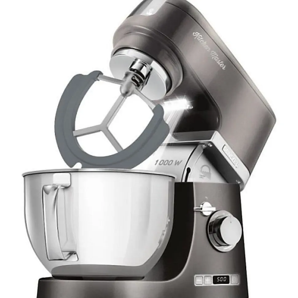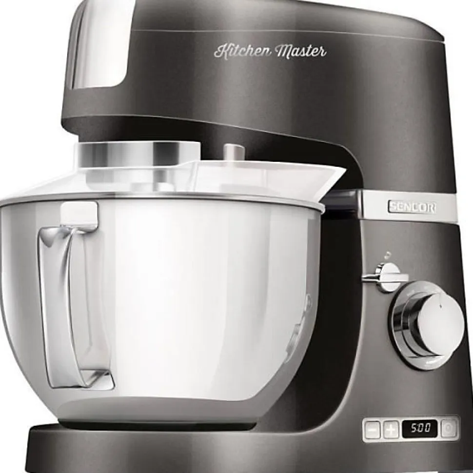 Robot pâtissier Sencor STM 7878BK : moteur 1000 W, bol inox 4,5 L, 8 vitesses avec fonction Pulse, affichage LED et éclairage du bol. Corps robuste en métal, accessoires multiples (pétrissage, fouettage, hachoir) et pièces compatibles lave-vaisselle.
