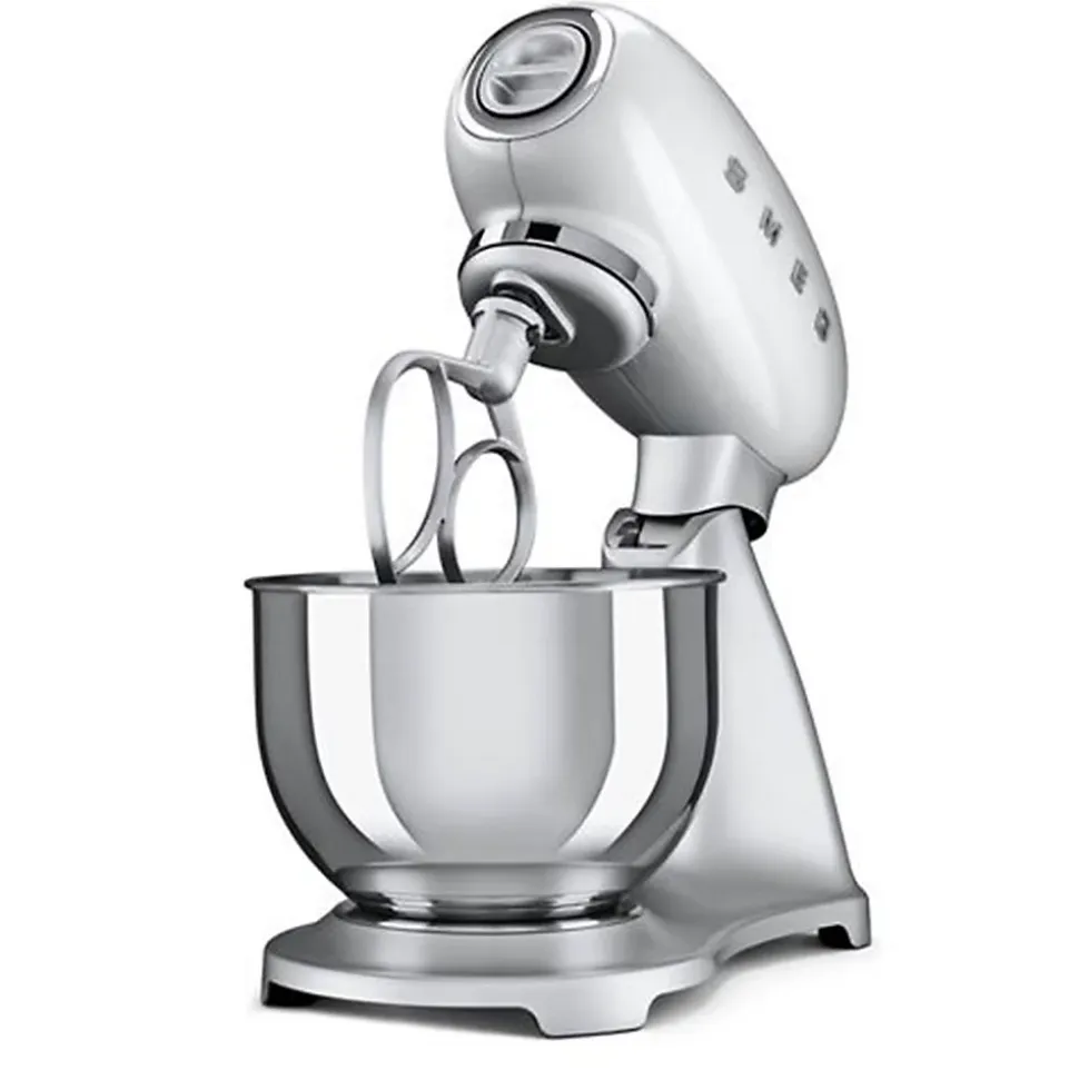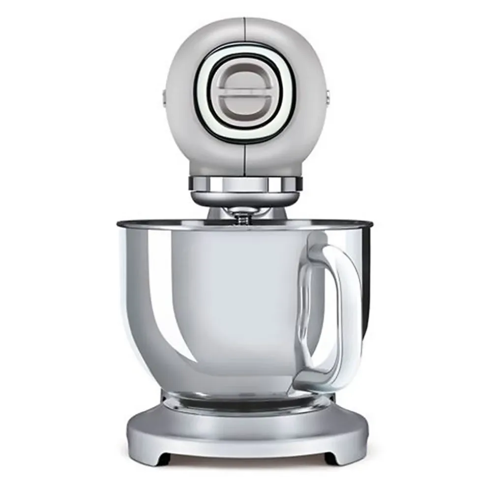 Robot pâtissier SMEG SMF02SVEU 800W design des années 50. Couleur Gris métal. 10 vitesses. Accessoires inclus : Fouet à fils. Batteur plat lavable au lave-vaisselle. Batteur plat. Crochet pétrisseur lavable au lave-vaisselle. Bol 4.8L. Couvercle verseur.