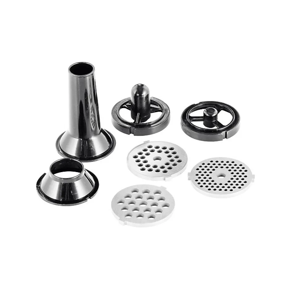 - Il est composé d’un kit pâtissier (fouet en inox, mélangeur et crochet à pétrin), d’un hachoir à viande, dont 3 grilles de hachages, d’un kit à saucisses et merguez et d’un kit à kebbés