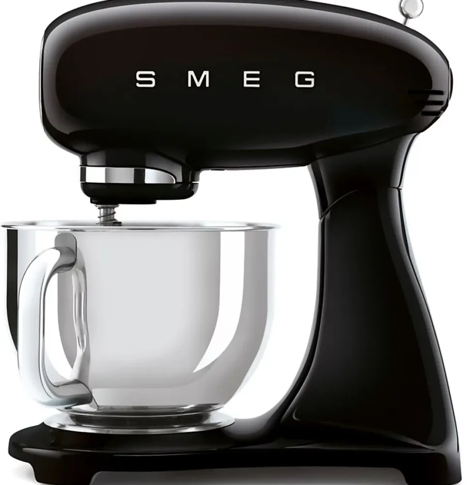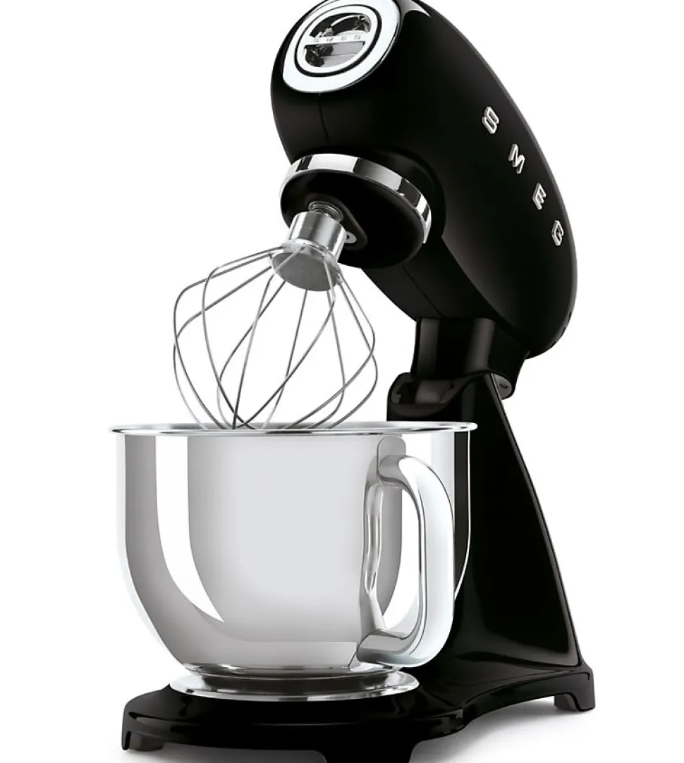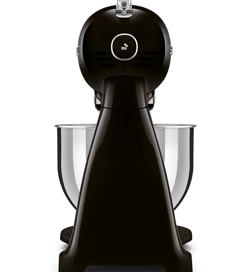 Robot sur socle 4.8l 800w noir Smeg – Robot sur socle Smeg SMF03BLEU en aluminium coulé vernis entièrement coloré. Base en alliage de zinc vernis. Levier de contrôle en acier inox. Bol de 4,8 litres et sa plaque de verrouillage en acier inox poli avec poignée ergonomique. Moteur à transmission directe. Mouvement planétaire. Protection surcharge moteur. Verrouillage commande lorsque la tête est relevée. Doté de 10 vitesses, avec mise en marche progressive. Sortie frontale pour accessoires. Range cordon intégré. Base antidérapante. – Type de produit : Robot pétrin.Matière corps : Aluminium.Matière bol : Inox.Capacité : 4.8 L.Nombre de vitesses : 10.Tension : 220-240 V.Fréquence : 50 Hz.Puissance : 800 W.Coloris : Noir.Capacité Farine standard : 1 Kg maximum.Capacité Farine intégrale : 0,8 Kg maximum.Capacité Blancs d’?ufs : 12 maximum, 2 minimum.Capacité Pâte pour tarte : 2,8 Kg maximum.Capacité Pâte pour pain, pizza, pâtes : 1,3 Kg maximum.Capacité Crème fouettée : 1 litre maximum.Longueur du câble : 1 m.Prise Schuko fournie.Accessoires fournis : Fouet à fils en acier inox, Batteur plat en aluminium, Batteur à bords flexibles en acier et silicone, Crochet pétrisseur en aluminium, Bol en acier inox de 4,8 litres et Couvercle verseur anti-projection.Dimensions (HxLxP) tête baissée : 378 x 402 x 221 mm.Dimensions (HxLxP) tête relevée : 490 x 402 x 221 mm.Poids net : 9.2 Kg.